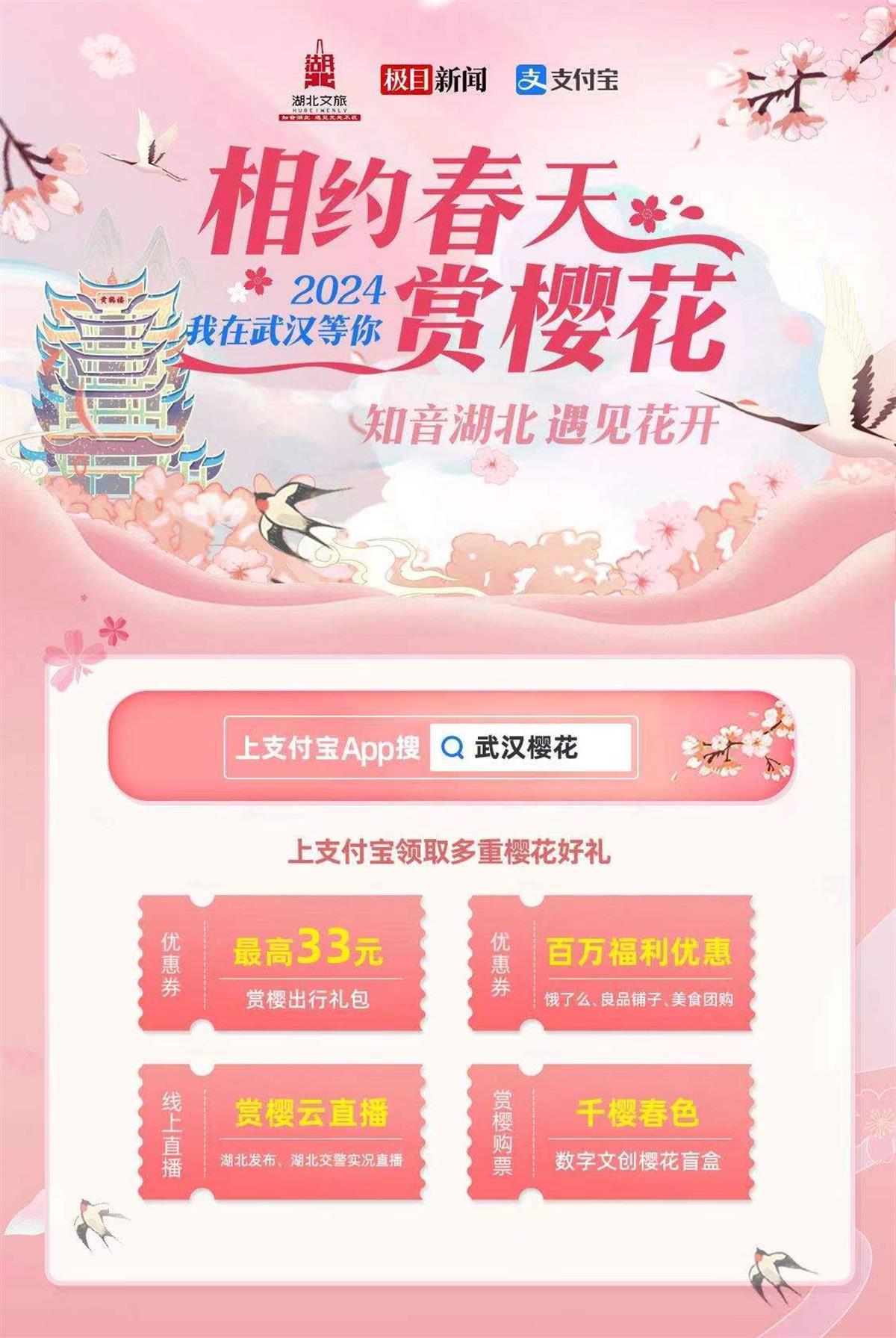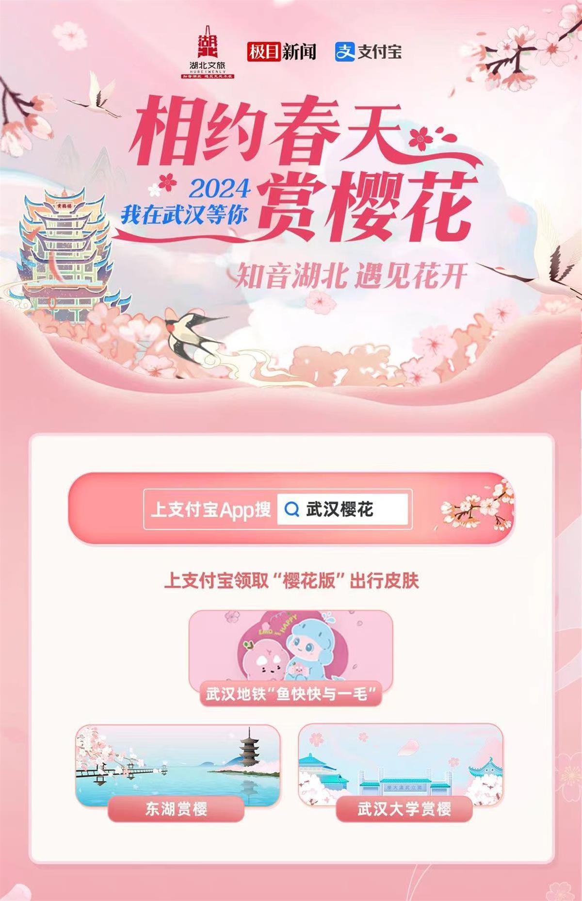 3月20日起,上支付宝APP搜索“极目新闻”或“武汉樱花”,即可进入“相约春天赏樱花”会场,八大热门赏樱点尽在“掌”握:武汉大学、东湖樱花园、汉口江滩、武汉晴川假日酒店、清凉寨景区、花博汇景区、堤角公园。