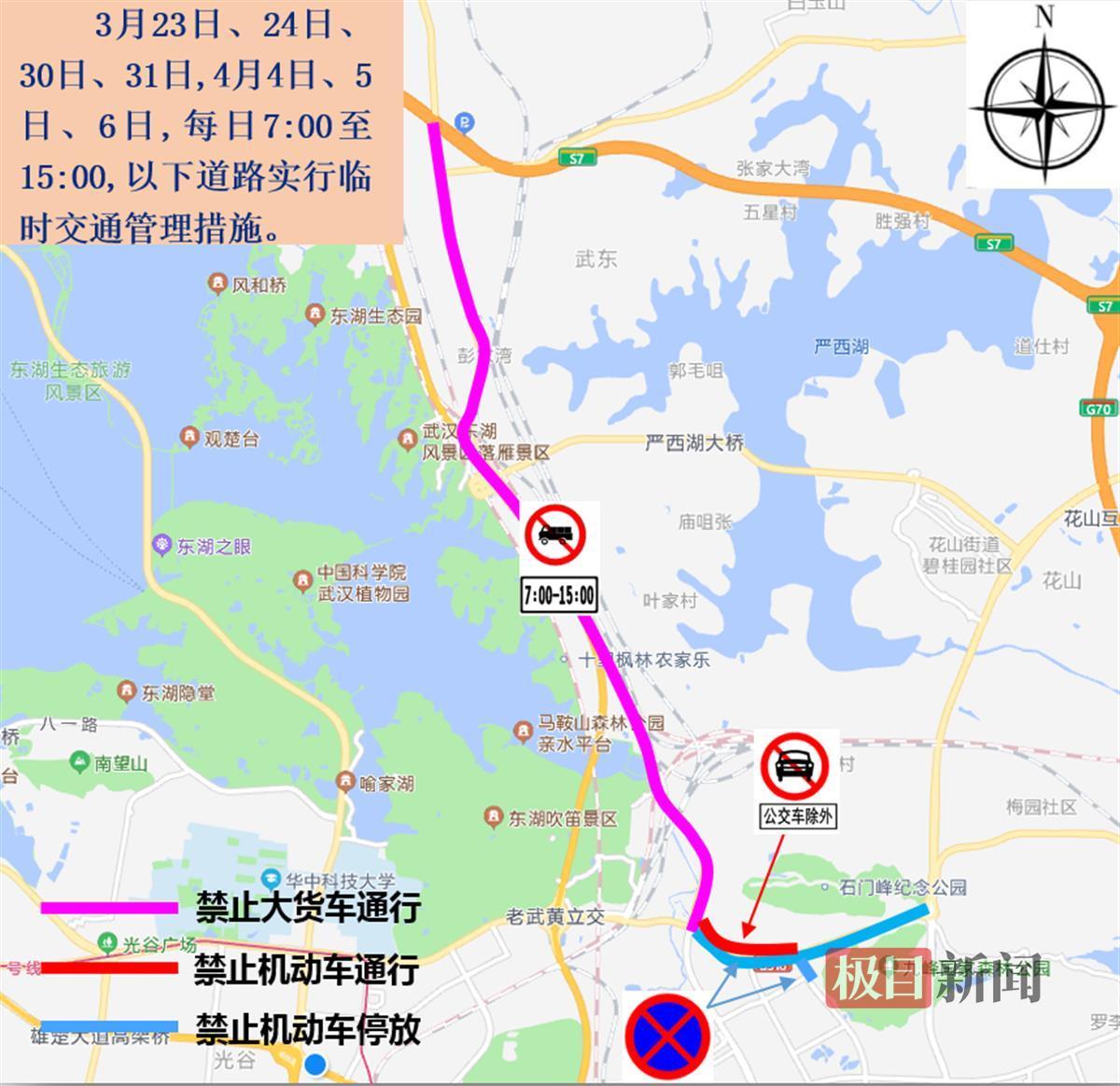 (二)青王路(落雁立交至珞喻东路)禁止载货汽车通行,青王路石门峰路口实行交通管制,自东向西单向通行。
