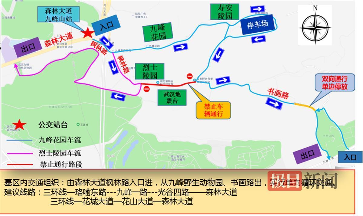 2024年3月23日、24日、30日、31日,4月4日、5日、6日每日7:00至15:00,机动车一律由森林大道枫林路口(寿安陵园)进,从九峰野生动物园路口、九峰一路书画路出,实行单向循环交通。