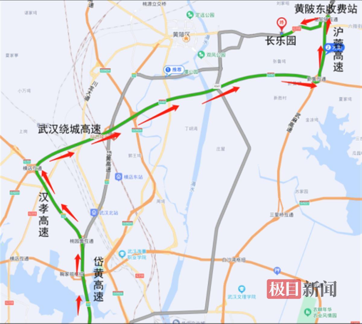 线路1:在桃园集互通处绕行汉孝高速→横店互通→武汉绕城高速→新集互通→沪蓉高速→骆驼铺互通→黄陂东收费站→G318→长乐园。