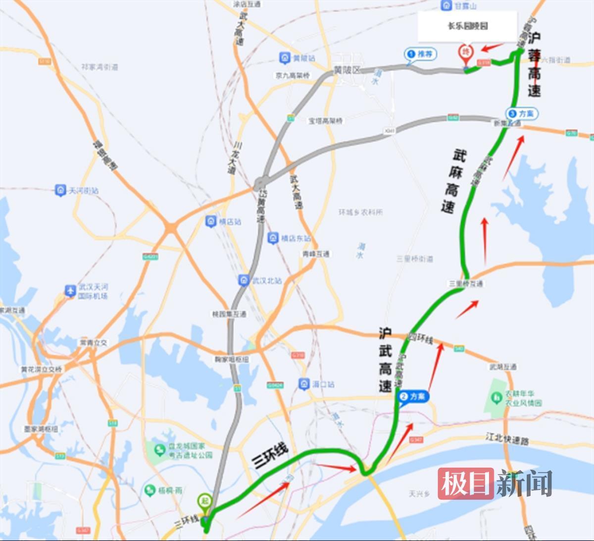 线路2:三环线→沪武高速→武麻高速→沪蓉高速→黄陂东收费站→G318→长乐园。