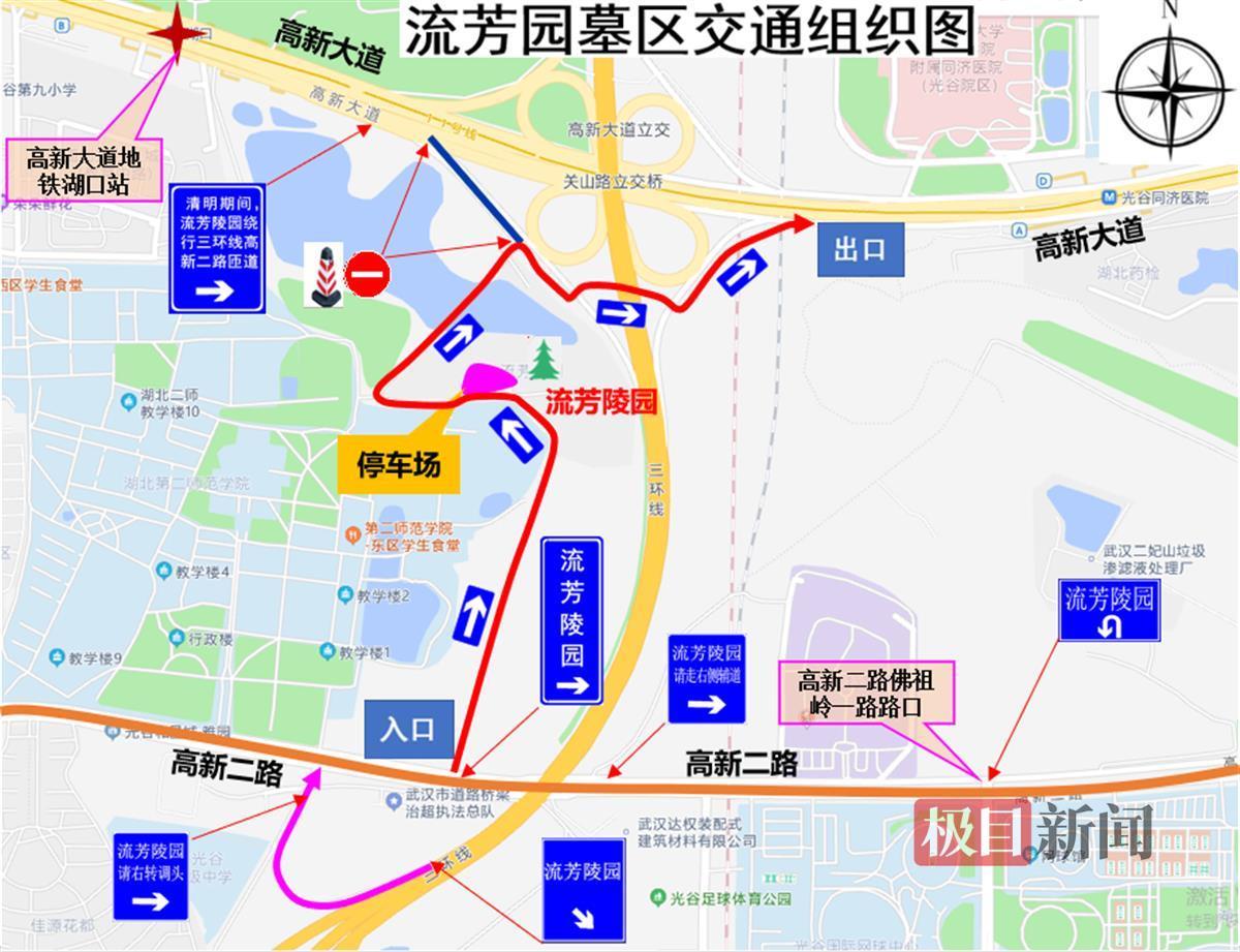 2024年3月23日、24日、30日、31日,4月4日、5日、6日,每日7:00至15:00,机动车一律由高新二路进出口进入,由高新大道进出口驶离(车高2.4米以内小型车辆经三环线高新大道C、E匝通道合流高新大道,车高超过2.4米大型车辆由高新大道辅道出),实行高新大道辅道→三环线匝道→三环线高新二路匝道下→高新二路佛祖岭一路路口调头→高新二路流芳陵园单向循环交通。