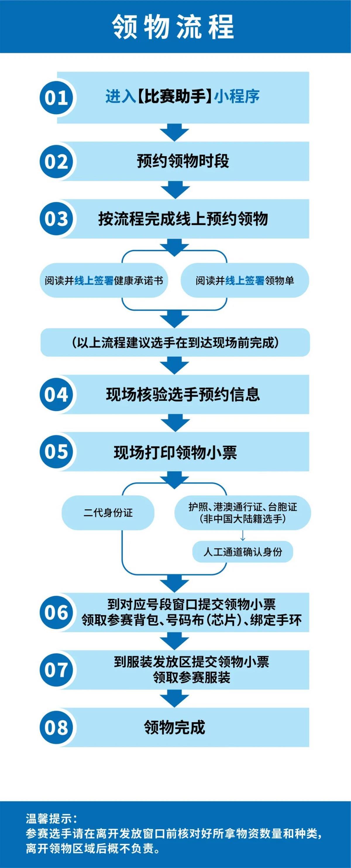 2024马拉松组委会提醒所有参赛选手,请务必携带本人有效身份证件到达现场,并凭本人有效身份证件入场。在领物前,应提前完成线上预约。对于未按上述规定提交相关材料或完成相应流程的选手,组委会有权拒绝发放参赛物品。