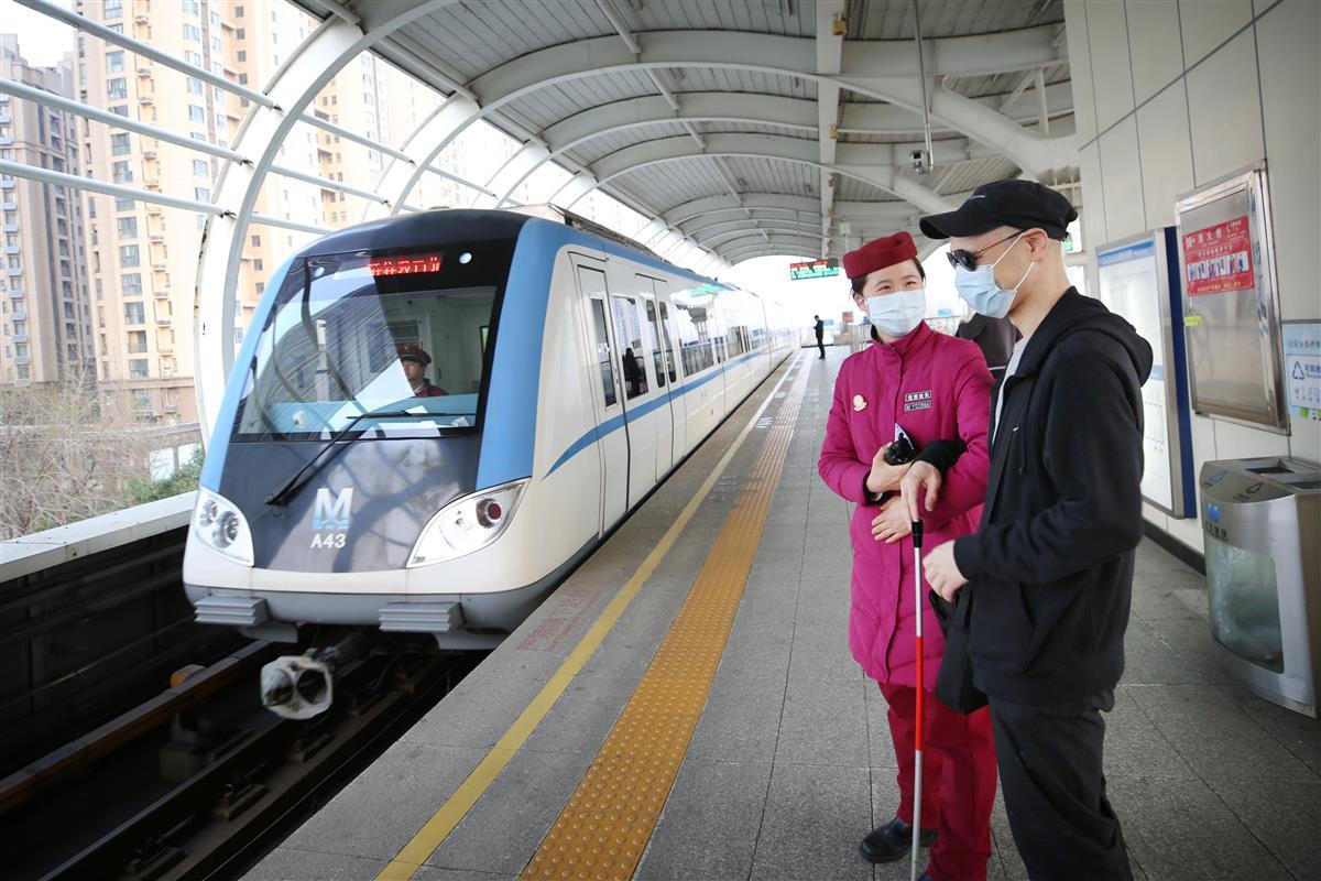武胜路地铁站M出口对面就是武汉市盲人按摩医院,每天会有多名盲人乘客从这里进出。为做好特殊乘客出行服务工作,车站结合“无障碍环境建设示范点”创建,推出了“梅红助行”特色服务,指派专人将有需要的盲人乘客护送至目的地。值班站长邹坦介绍,车站建立起详细的帮扶台账,掌握每天有服务需求的特殊乘客的出行规律,设置好提醒闹钟,安排专人接应送达,其中任大鹏在岗期间已经接应了3年,很多盲人乘客在“未见其人但闻其声”中叫出他的名字。