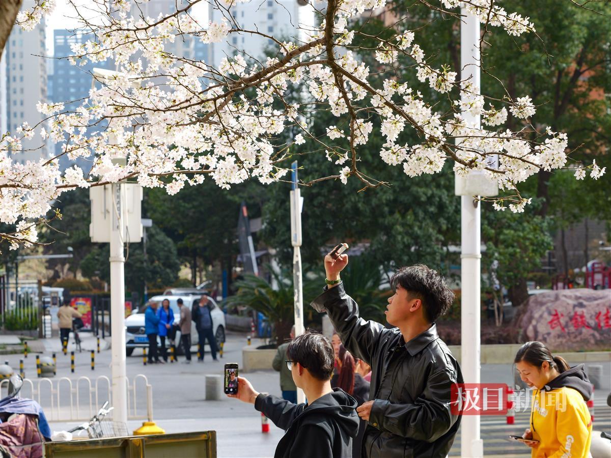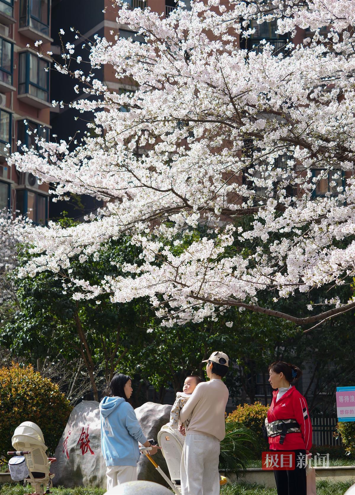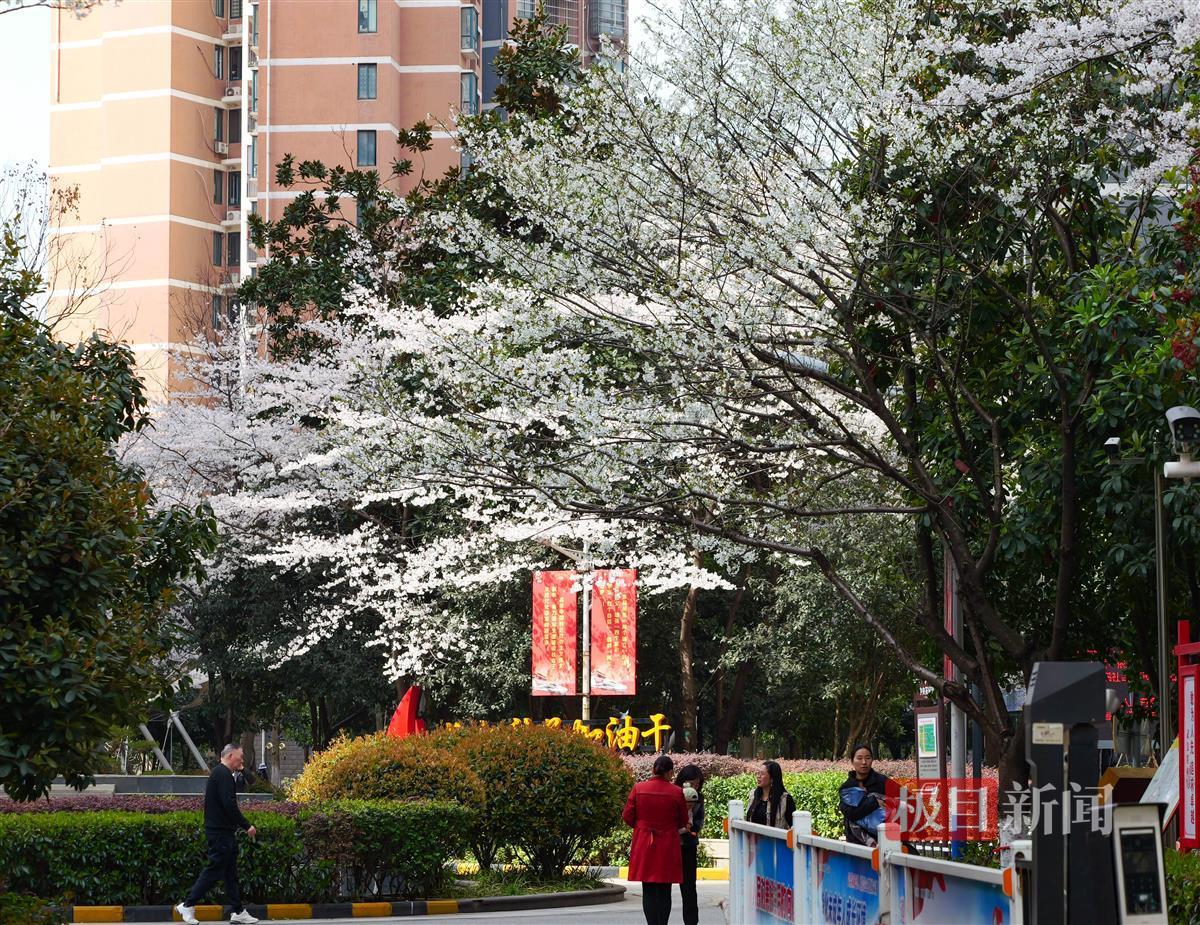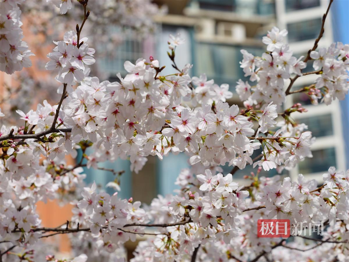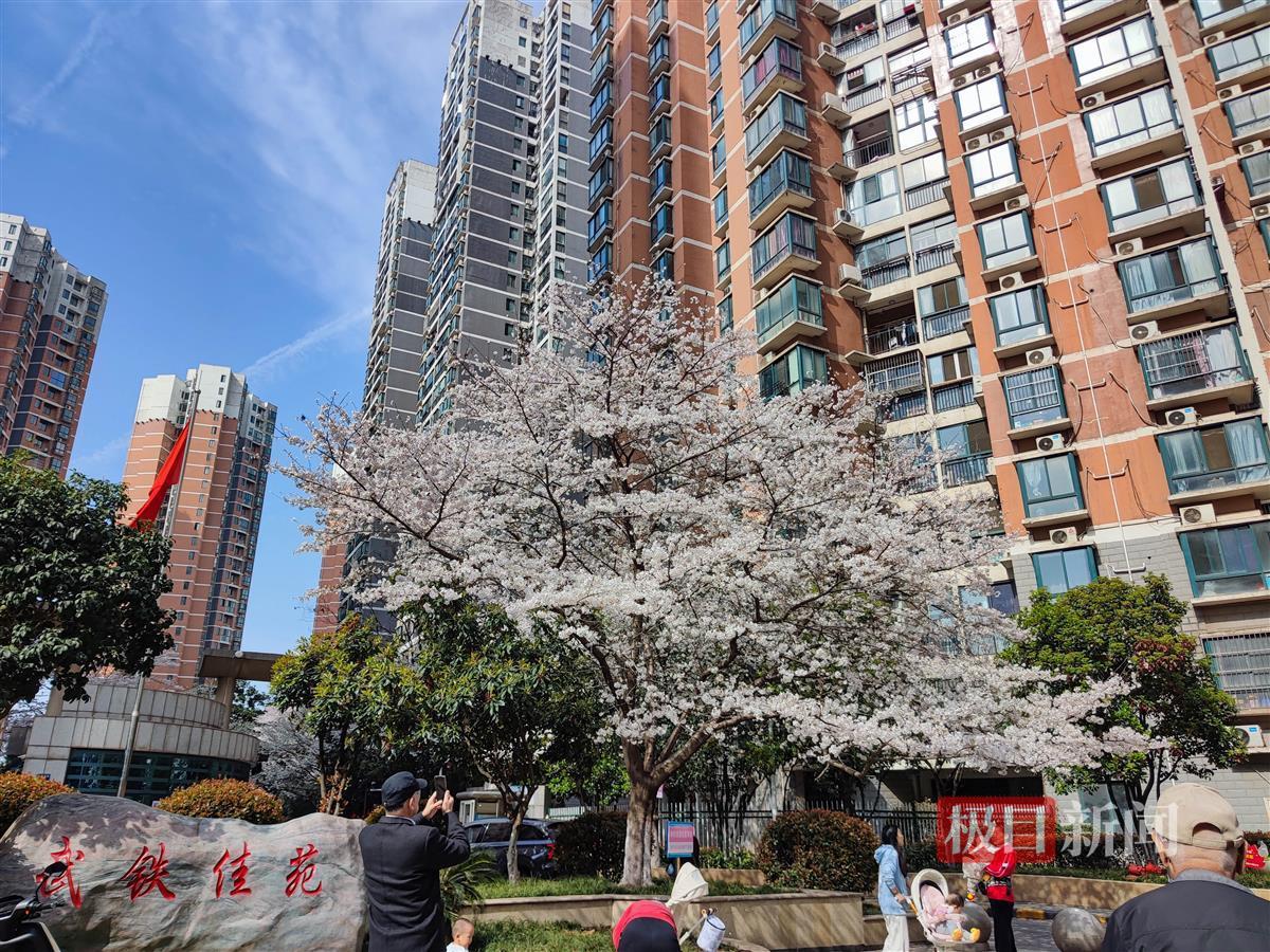 武汉正值赏樱季,樱花进入盛放期。连日来,武汉市洪山区武铁佳苑小区内,近百棵樱花树竞相绽放,悄然成为一处热门打卡点。