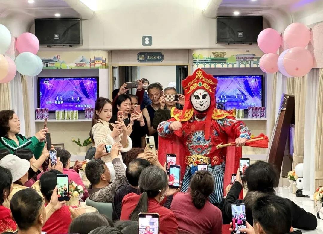 同时,列车上开展K歌争霸赛、川剧变脸、古筝表演等主题活动,并随机派发铁路文创产品,让旅客感受快乐出行的浓厚氛围。