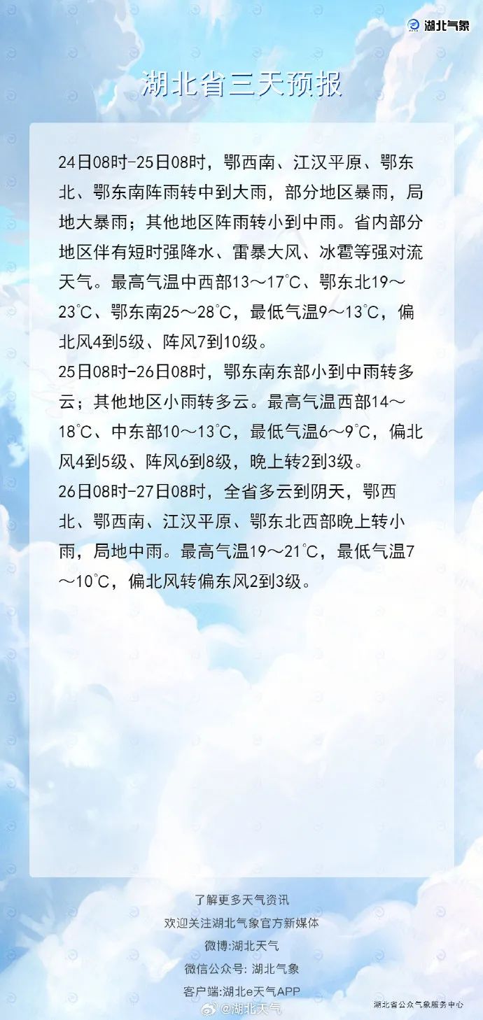 昨天(23日)07时至今日07时,湖北大部出现雷雨伴有大风和局地冰雹,东部和北部出现中到大雨,其中黄冈、咸宁等地出现暴雨,国家站中最大雨量出现在崇阳,达到87.9毫米。