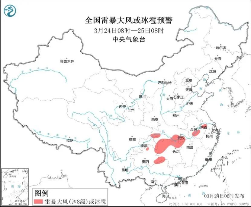 安徽中南部、江苏南部、湖北东南部、湖南北部和西南部、江西西北部、重庆东部和北部、贵州东部、广西北部等地的部分地区将有8~10级雷暴大风或冰雹天气。强对流的主要影响时段为今天傍晚至夜间。中央气象台今晨继续发布强对流天气蓝色预警。