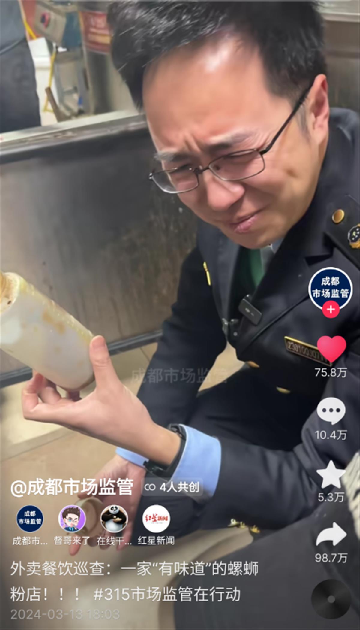 3月13日,据成都市市场监管局官方账号,该局工作人员巡查了当地一家评分为4.7分、月销四五千单的外卖螺蛳粉店。到店后,工作人员发现该店的环境脏乱,还在店内柜子里发现了“螺蛳粉加臭酱”。工作人员闻了后,被刺激的气味熏得不停咳嗽。