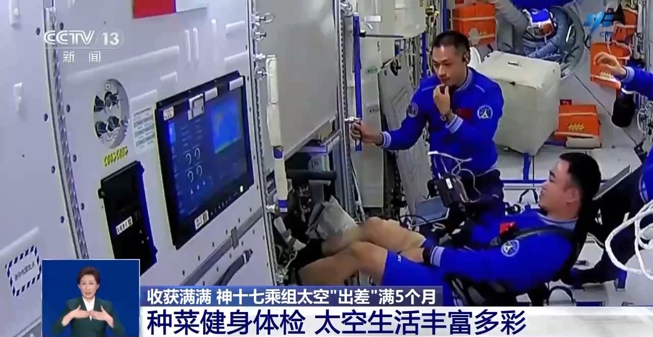 在工作之余,神舟十七号航天员乘组在轨锻炼、定期体检,保持良好的身体状态。