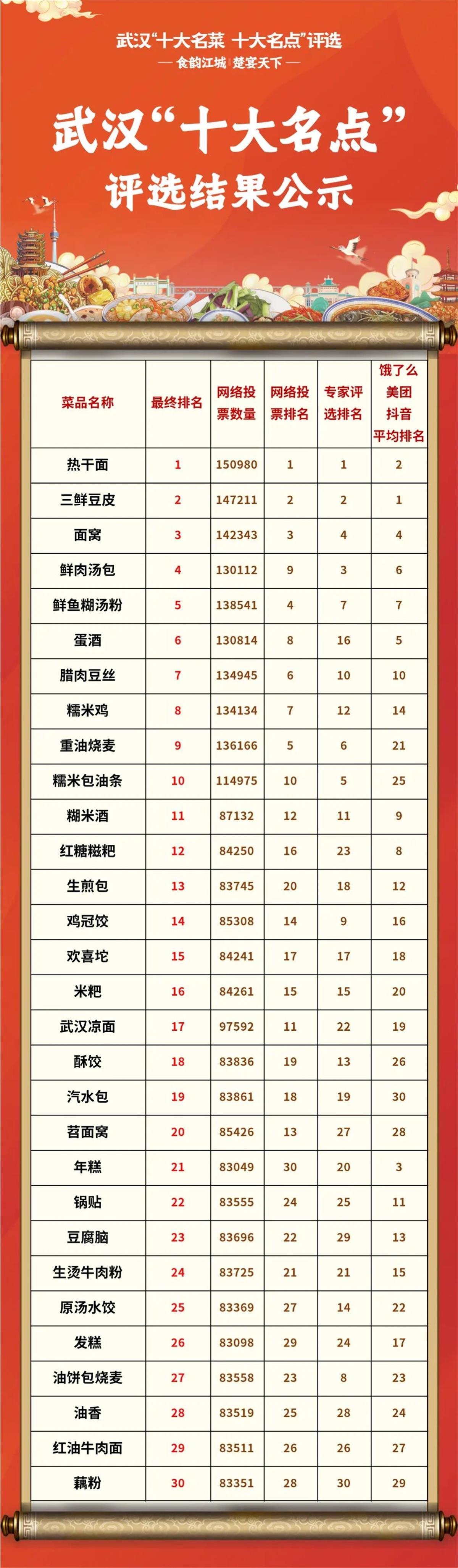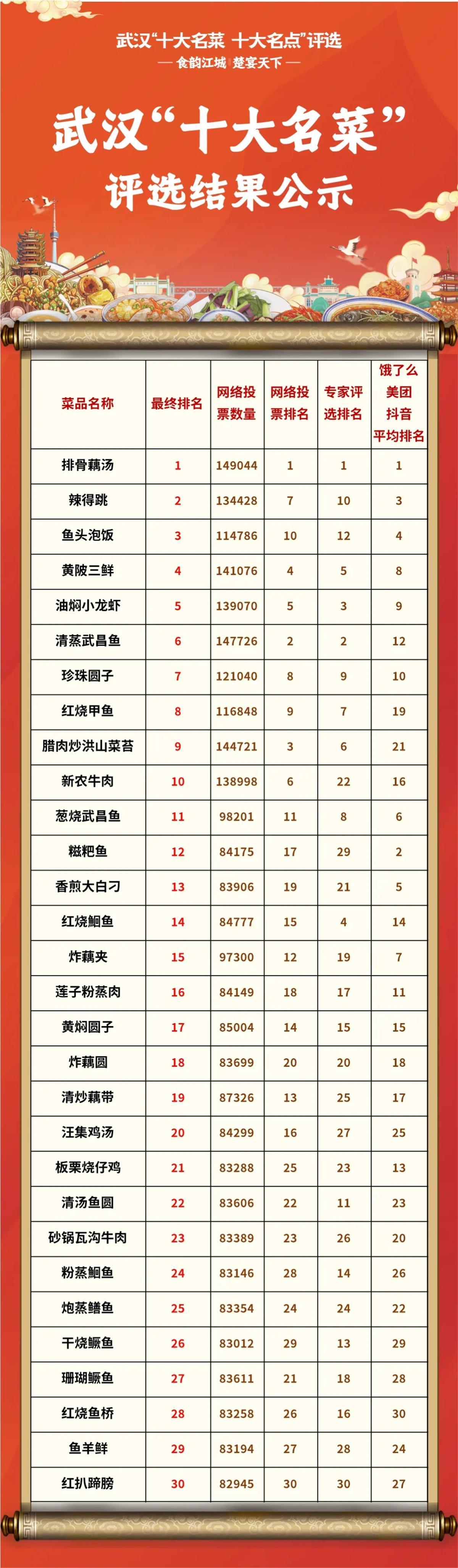 最终,按照评选市民投票占比60%、专家评审占比20%、平台数据占比20%的规则,汇总网络投票、平台综合数据、专家评选所产生的评分,综合得出武汉“十大名菜、十大名点(小吃)”30强排名榜单,并于3月27日起进行公示。