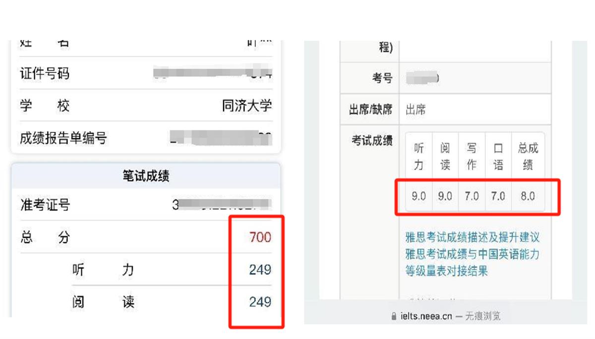 在英语四级和雅思考试中,叶隽扬在听力和阅读部分均拿到了满分。他的四级成绩为700(满分710),雅思成绩为8.0。
