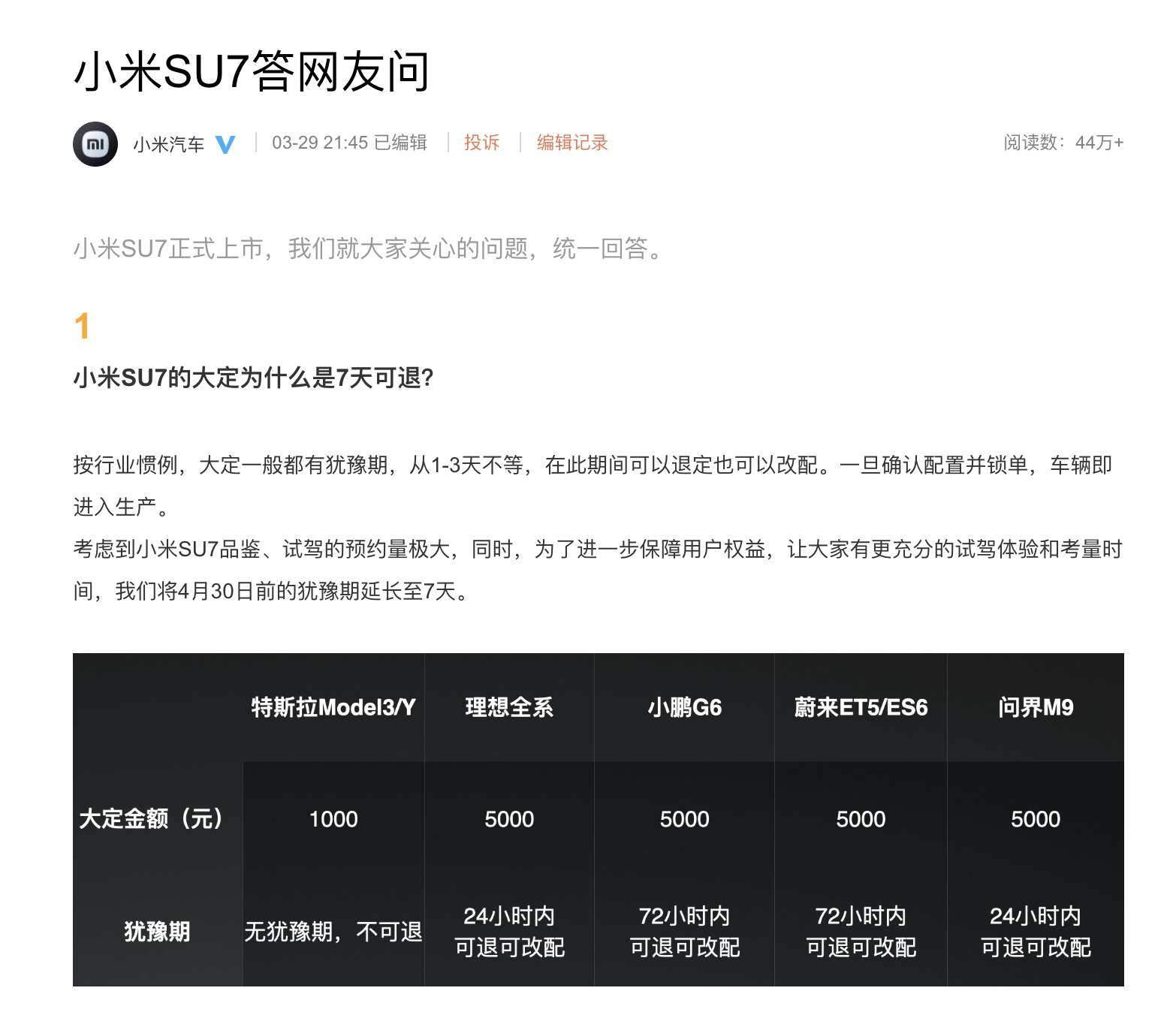 “按行业惯例,大定一般都有犹豫期,从1-3天不等,在此期间可以退定也可以改配。一旦确认配置并锁单,车辆即进入生产。考虑到小米SU7品鉴、试驾的预约量极大,同时,为了进一步保障用户权益,让大家有更充分的试驾体验和考量时间,我们将4月30日前的犹豫期延长至7天。”小米说道。