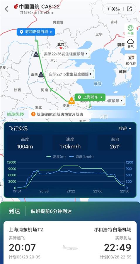 “航旅纵横”APP显示,CA8122于28日20时07分从上海浦东机场起飞,22时49分到达内蒙古呼和浩特白塔机场,飞行过程中出现多次轻度和中度颠簸情况。