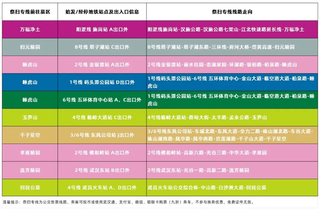 为保障清明祭扫乘客便捷舒适出行,与公交祭扫专线无缝接驳的武汉东站、佛祖岭、东风公司、金银潭、码头潭公园、塔子湖、施岗等地铁车站,均张贴有临时指引标志,祭扫客流高峰时段安排专人进行引导。
