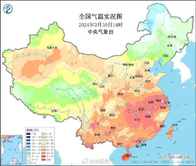 30日午后,南方大部气温都超过了25℃,在湖南北部、湖北东部、安徽南部、江苏南部、浙江北部一带,部分地区到达或超过了30℃。截至14时,多个站点的最高气温甚至追平或打破当地旬或月最高气温纪录。