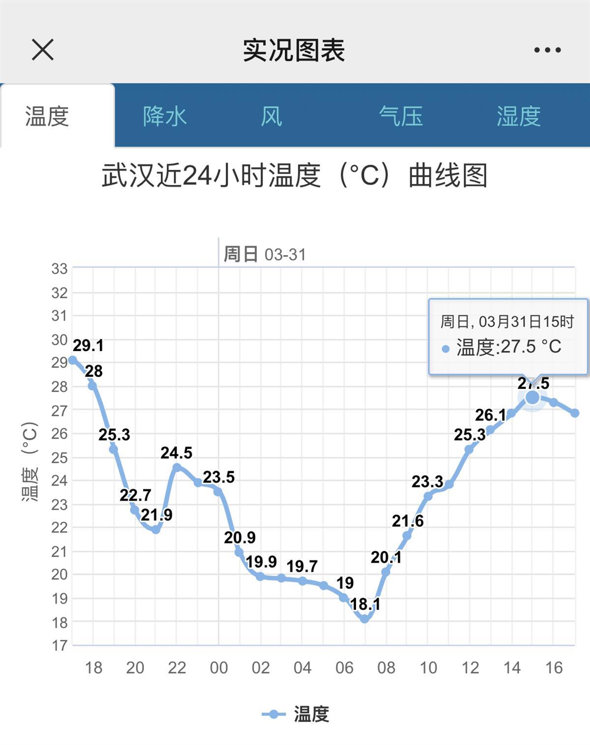 雷雨夜间发威,但今晨武汉说晴就晴了,午后高温达到27.5℃,比昨日(30日)31.2℃降低了不少。不过,还是夏天的风格。