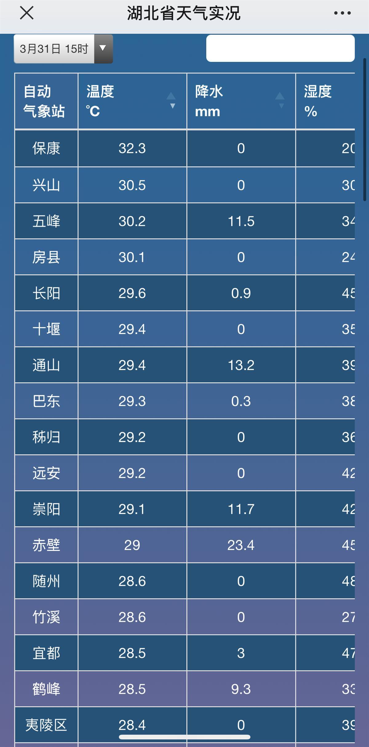 湖北全省来看,昨夜午后到夜间,湖北东部和南部遭遇雷雨大风、局部泼下大雨和暴雨。今天白天湖北大部地区延续着昨日的初夏风情,下午3时,大部地区最高温在25℃以上,十堰、宜昌和咸宁地区高温在30℃左右,保康以32.3℃位居第一。