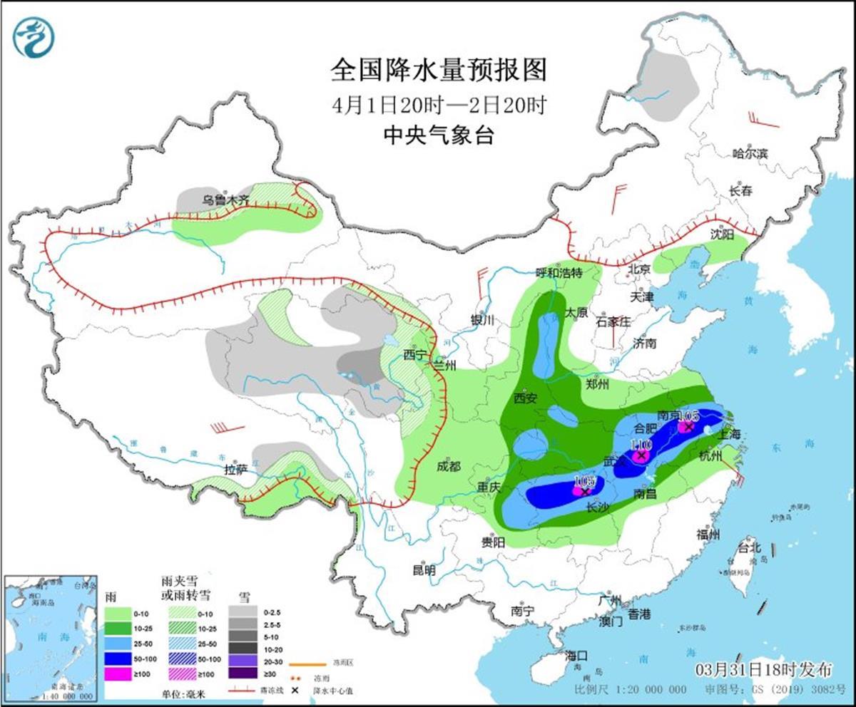 中央气象台今日18时继续发布暴雨蓝色预警和强对流天气蓝色预警:预计3月31日20时至4月1日20时,湖北东南部、湖南、江西、福建西北部、四川东部、重庆中西部、贵州东部、广西北部、广东北部等地部分地区有大到暴雨,其中,湖北东南部、湖南东北部、江西东部和南部、福建西北部、广东东北部等地局地有大暴雨(100-150毫米);