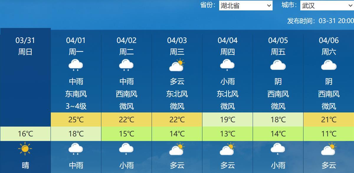 武汉4月1日白天,多云转雷阵雨18-25℃,偏东阵风5-6级,4月1日晚到4月2日阴天有中到大雨,局部暴雨,伴有强对流天气18-22℃;4月2日晚到4月3日,阴天有小到中雨,偏北阵风5级,16-22℃。