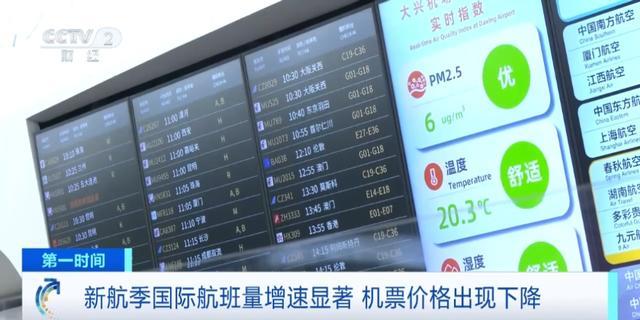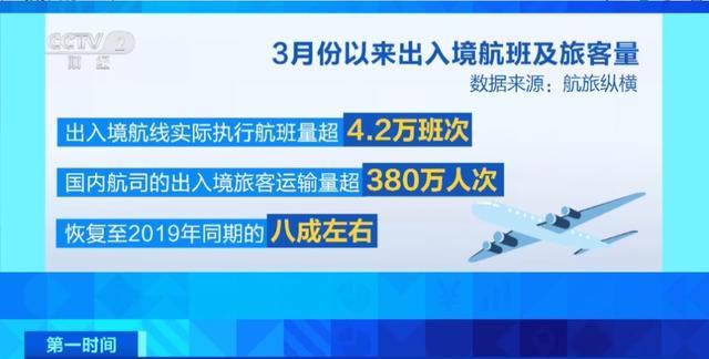 新航季国际航班量增速显著,带动出入境客流量大幅增加。平台数据显示,今年3月以来,出入境航线实际执行航班量超4.2万班次。国内航司的出入境旅客运输量超380万人次,恢复至2019年同期的八成左右。随着更多国际航线的恢复,机票价格也出现下降。