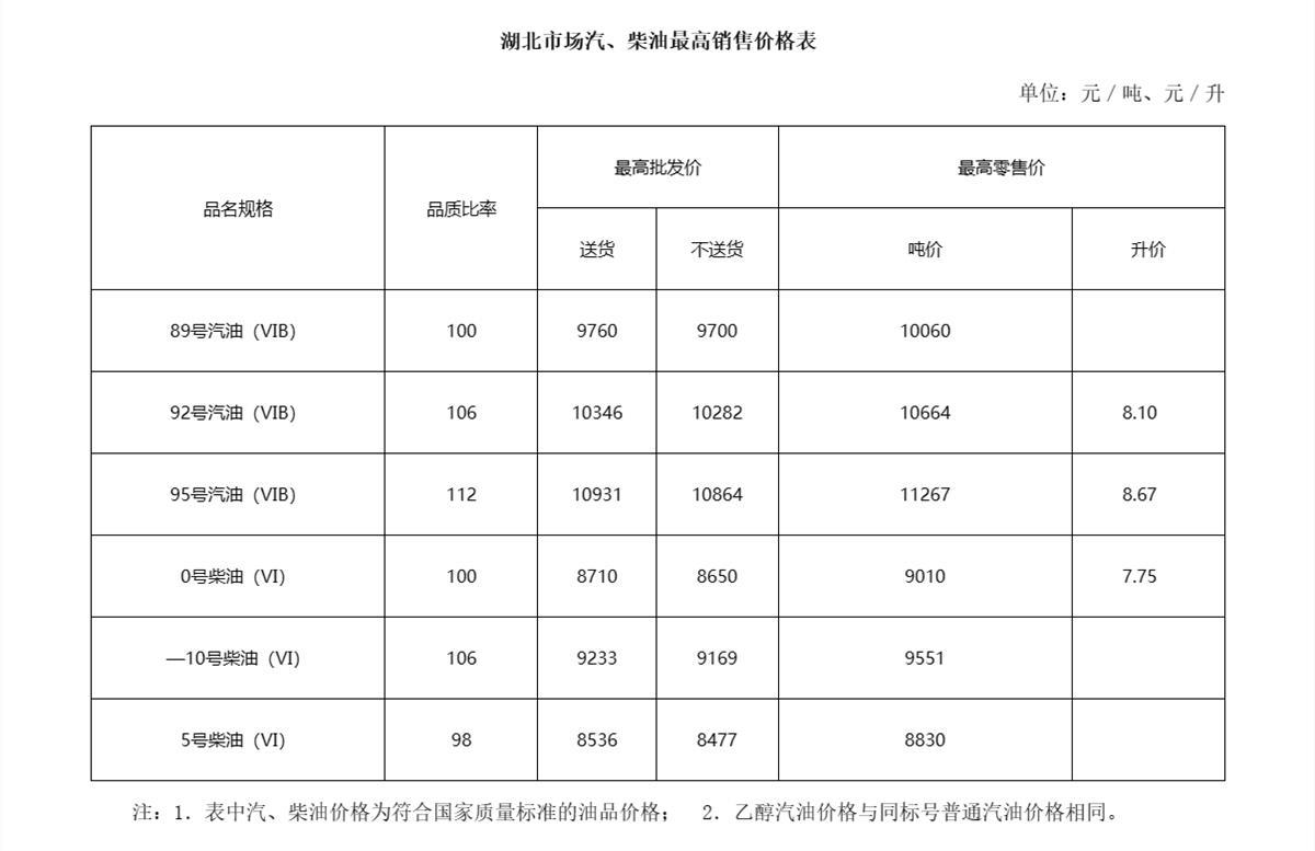 湖北市场油价(图源:湖北省发改委)