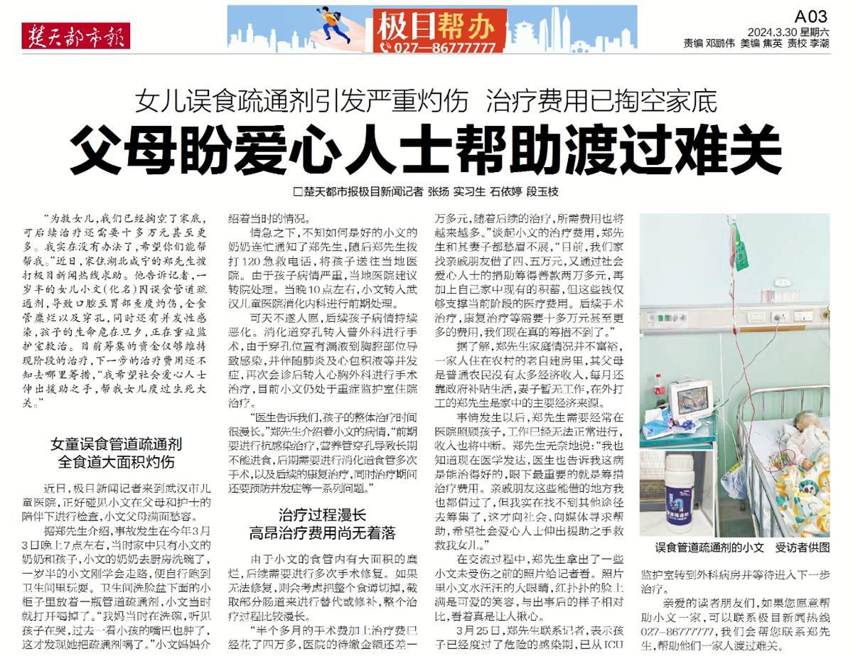 近日,一名来自湖北咸宁的一岁半女孩小文(化名)得到了广大读者的关注与帮助。今年3月初,小文因误食管道疏通剂导致食管大面积灼伤糜烂,后续治疗费用高达数十万,其父郑先生向媒体和社会大众寻求帮助(详见《楚天都市报》3月30日报道)。报道刊发后,社会上众多好心人通过极目新闻热线给小文捐款,3月30日至4月1日的三天时间,共有7位读者向小文捐款6900元。面对广大读者的帮助,郑先生感激地说:“小文的治疗正在关键时刻,你们大家真是及时雨啊!”