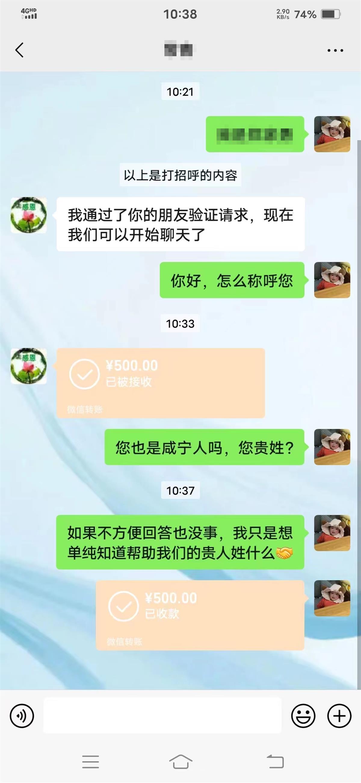 4月1日,两位分别来自湖北咸宁和黄石的爱心读者拨打极目新闻热线电话,希望联系上小文的父亲进行捐款。在联系上小文的父亲郑先生后,两位读者分别向小文各捐款500元。其中来自咸宁的读者是通过微信红包的方式捐款,面对好心人的帮助郑先生想知道对方姓什么,可对方没有回答,只是发了500元红包。“连帮助自己的人姓什么都不知道,我是既感激又有点愧疚。”郑先生说。