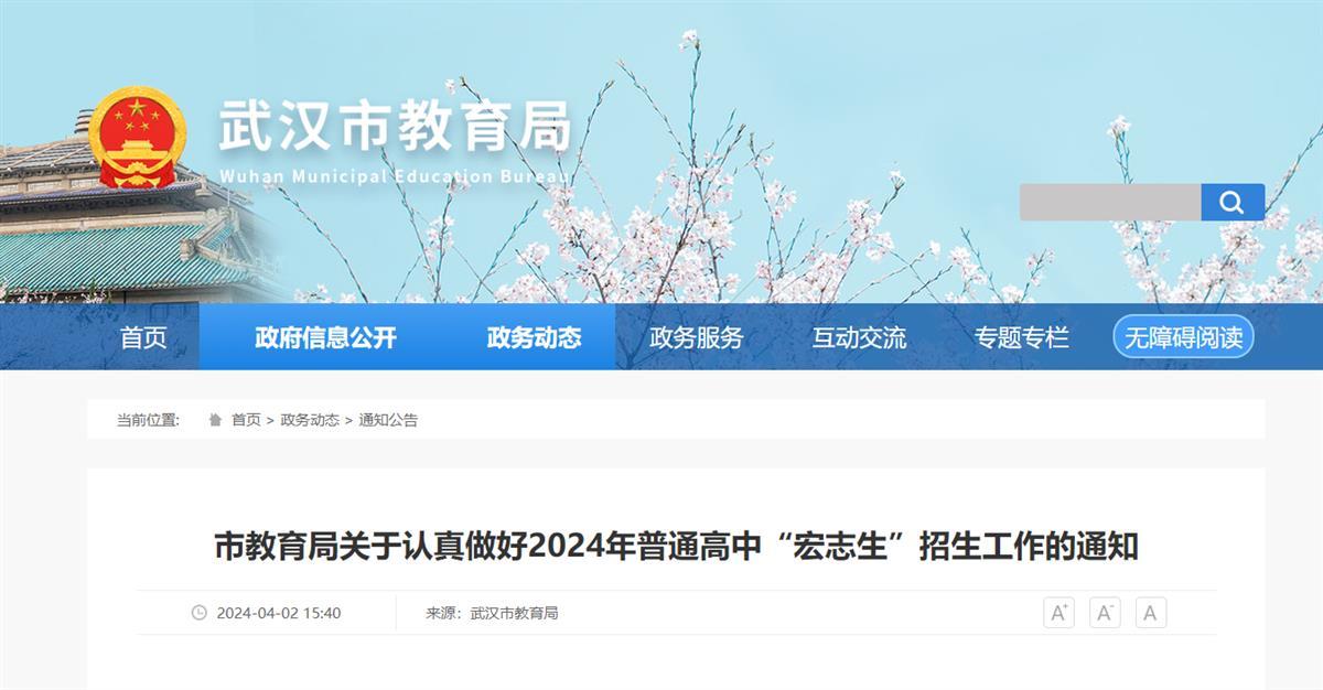 4月2日,武汉市教育局官网发布关于认真做好2024年普通高中“宏志生”招生工作的通知,“宏志生”资助对象为武汉市初中应届在籍毕业生中品学兼优、家庭贫困、无经济能力完成高中学业的学生。学生本着自愿的原则,应在4月14日前,向所在初中学校提出申请。