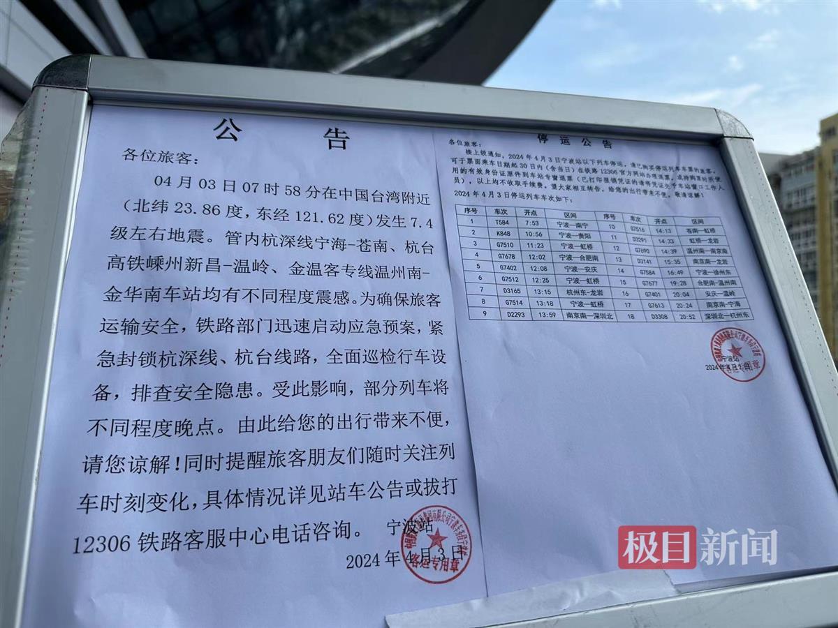 上午8时56分,中国铁路上海局宁波车务段发布消息表示,中国台湾花莲县海域发生7.3级地震,管内杭深线宁海—苍南、杭台高铁嵊州新昌—温岭、金温客专线温州南—金华南车站均有不同程度震感。为确保旅客运输安全,铁路部门迅速启动应急预案,紧急封锁杭深线、杭台线路,全面巡检行车设备,排查安全隐患。受此影响,部分列车将不同程度晚点。