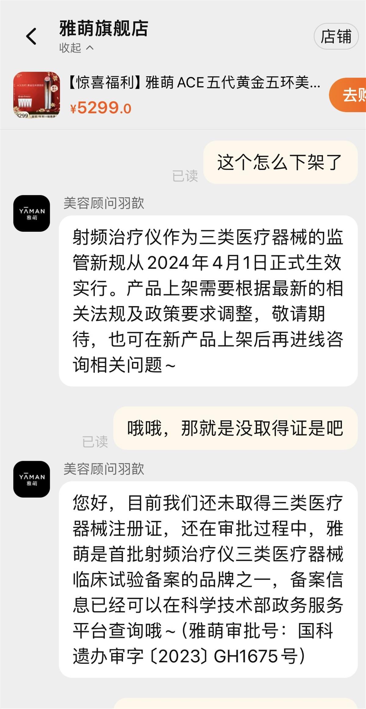 4月1日,市民张小姐发现此前添加至购物车的一款货值5299元的雅萌ACE五代黄金五环美容仪器已经下架。询问品牌客服才得知,是因4月1日监管新规正式施行,产品予以下架,产品上架需要根据最新的法规及政策要求进行调整。