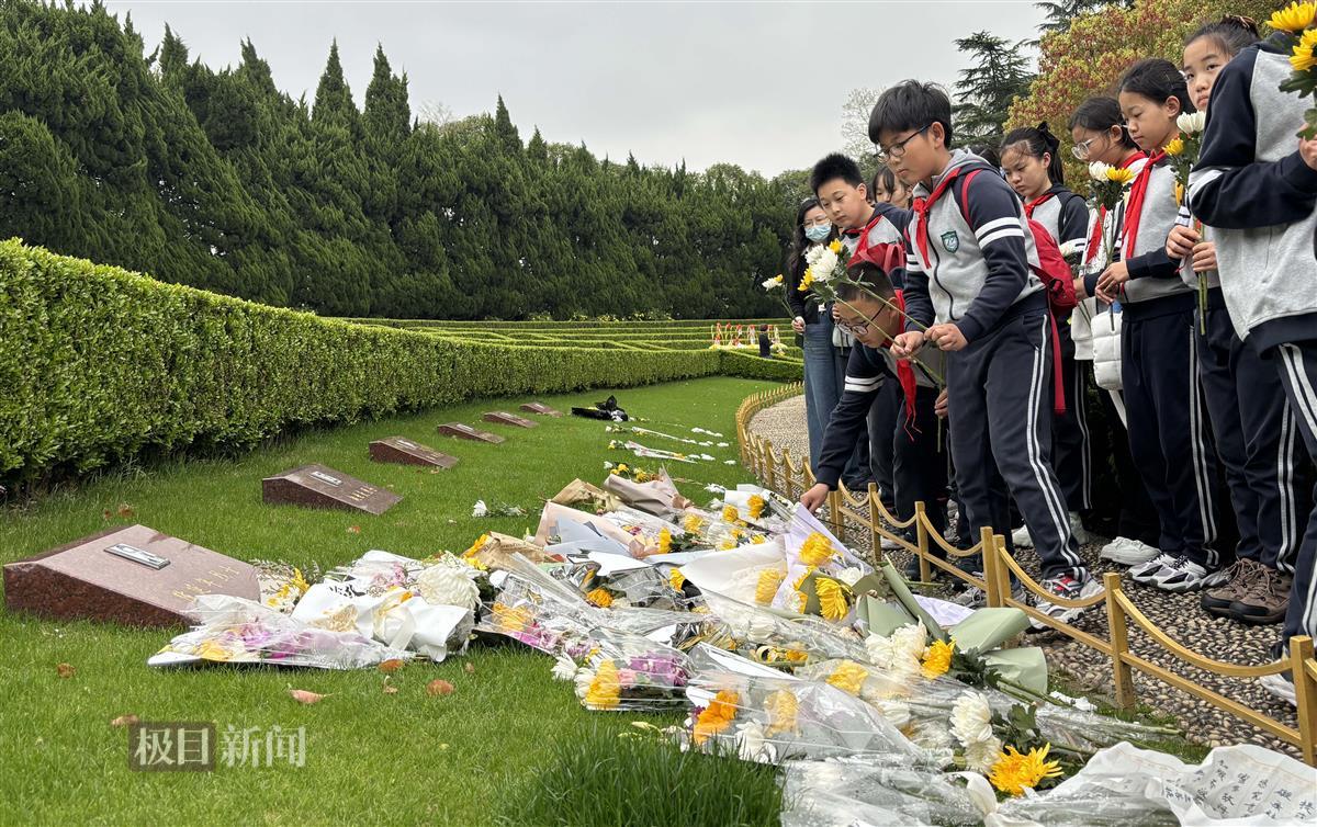 极目新闻记者在现场还看到,上海市新普陀小学五年级的同学们也来到陈延年和陈乔年烈士墓前,敬献鲜花、默哀3分钟,并诵读学习了烈士的事迹。