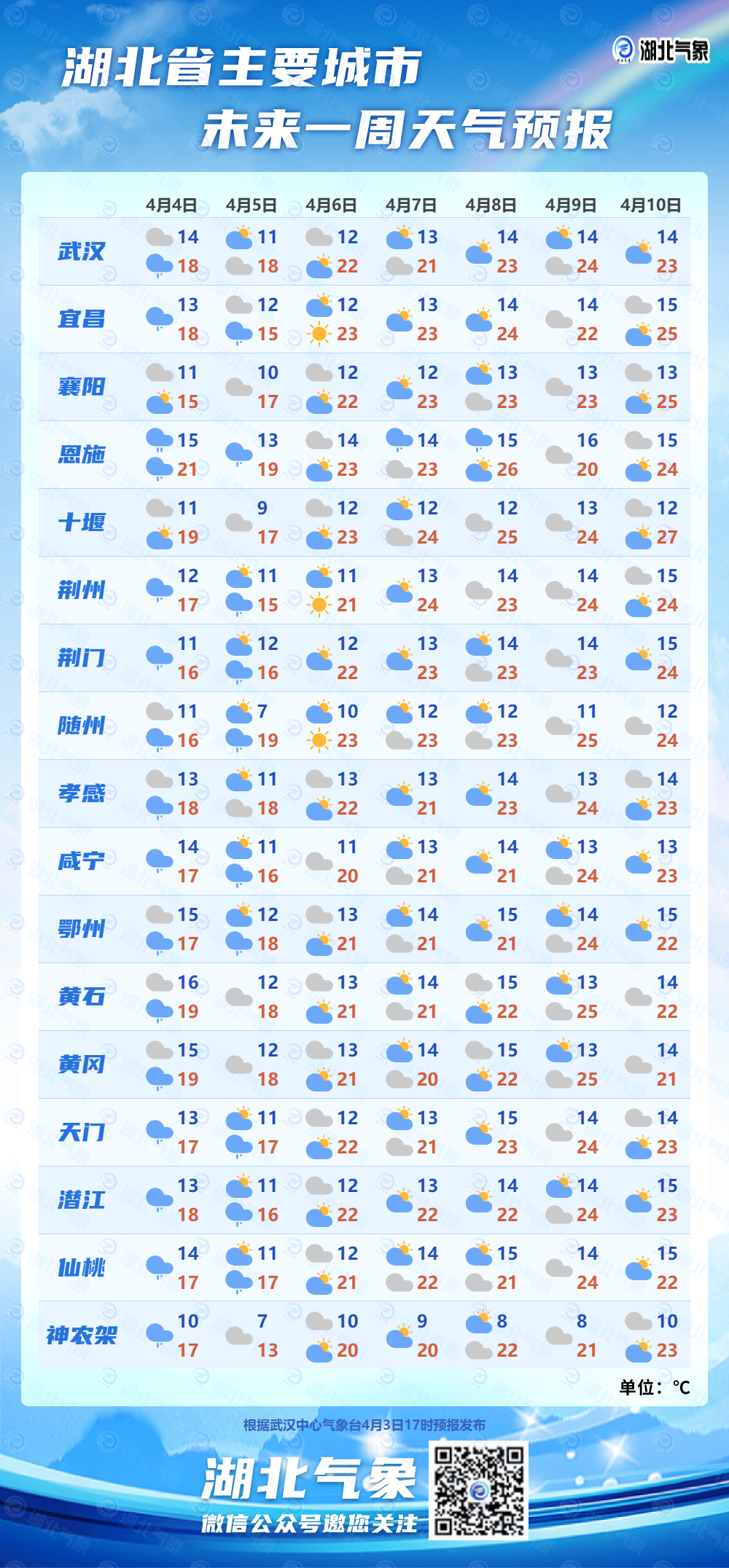 昨日(3日),湖北省降水减弱,湖北省西部和南部有小雨飘洒,恩施地区出现中雨、局地大雨,其他地区以阴天到多云为主。湖北省大部最高气温在17~22℃,受冷空气和阴雨天气影响,南部和鄂西北地区高温较前一日下滑2~4℃。今晨,大部最低气温在10~15℃。