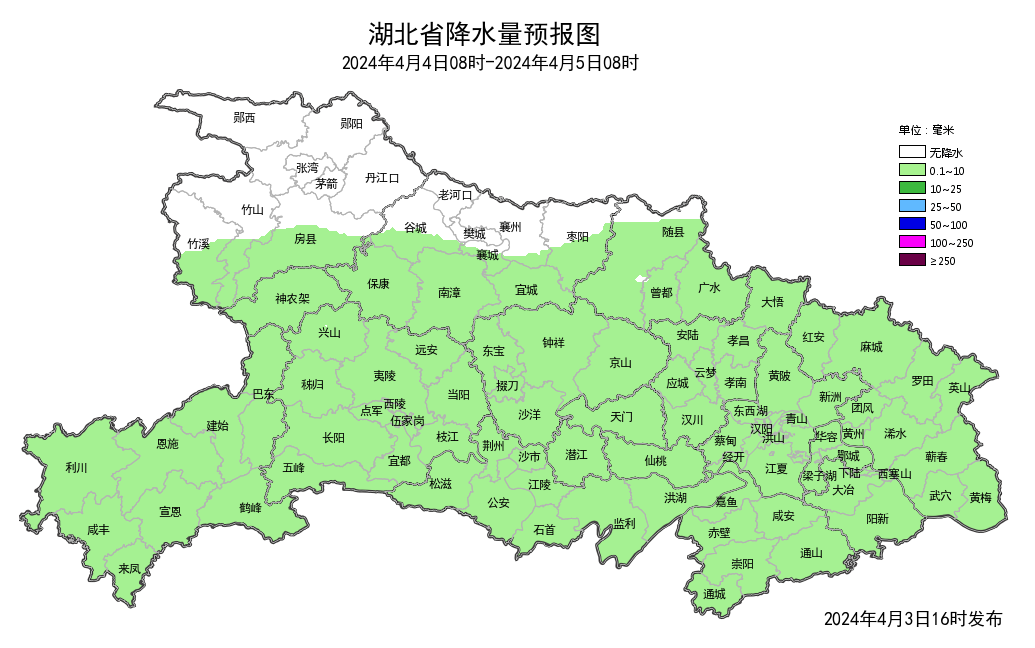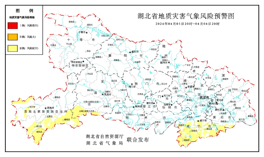 2024年4月3日20时—4月4日20时,预计恩施(利川、咸丰、来凤、宣恩、鹤峰)、宜昌(五峰)、咸宁(咸安区、赤壁、崇阳、通城、通山)、黄石(阳新中部和南部)以及其他强降水区域发生崩塌、滑坡、泥石流的风险较大。
