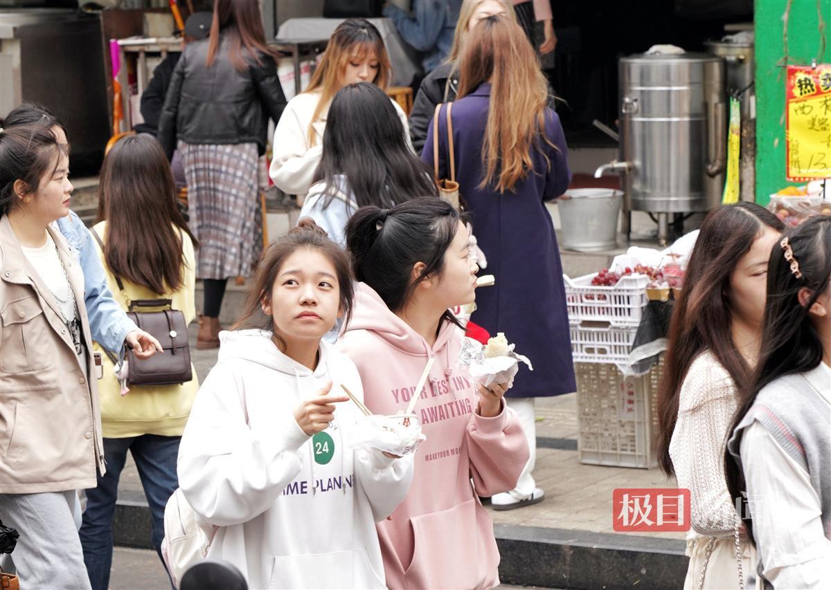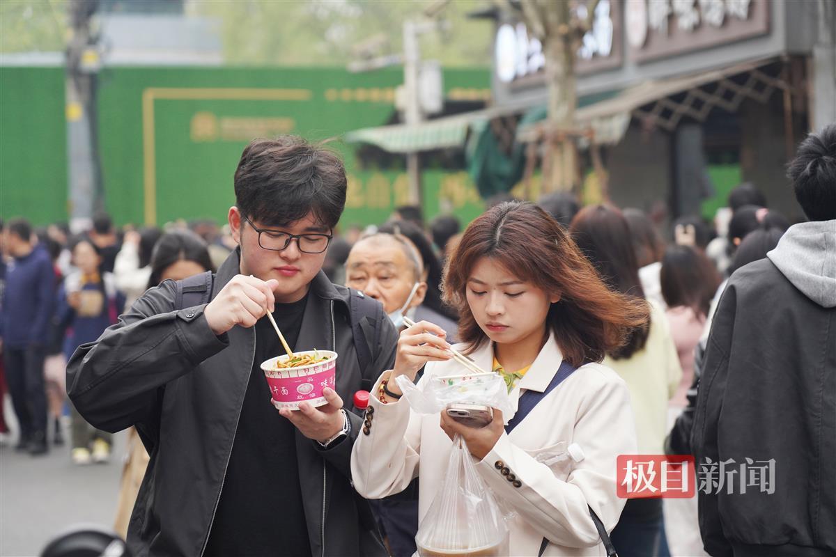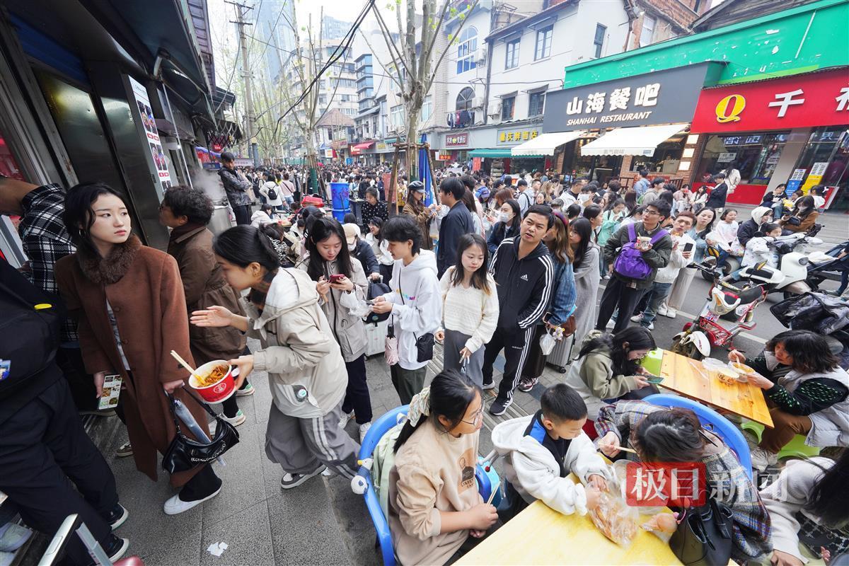 4月4日,早上8时,许多游客已经抵达武汉山海关路开启“过早”之旅。山海关路被誉为“碳水爱好者”的快乐老家,短短百来米全是好吃的早点:糯米包、油条、豆皮、鸡冠饺、吊子煨汤、牛肉面等各家商户前排起长队,人群摩肩接踵,许多游客是边吃边排队。