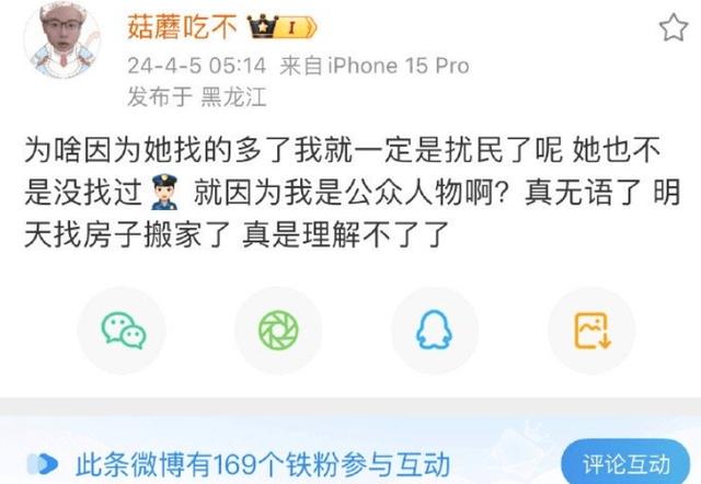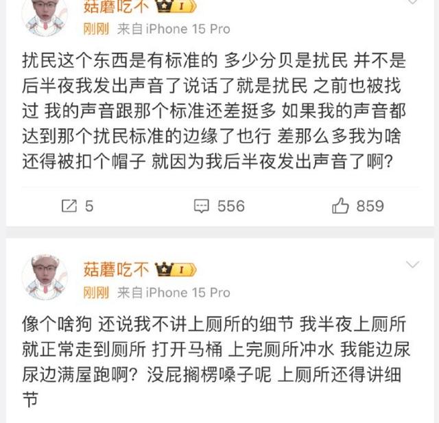 随后,陈泽微博账号@菇蘑吃不 发文回应扰民:称邻居在门口踹门,还称报警,他自己承认自己虽然发出声音了,但远没达到扰民标准,并说自己可以买一个测分贝的仪器。