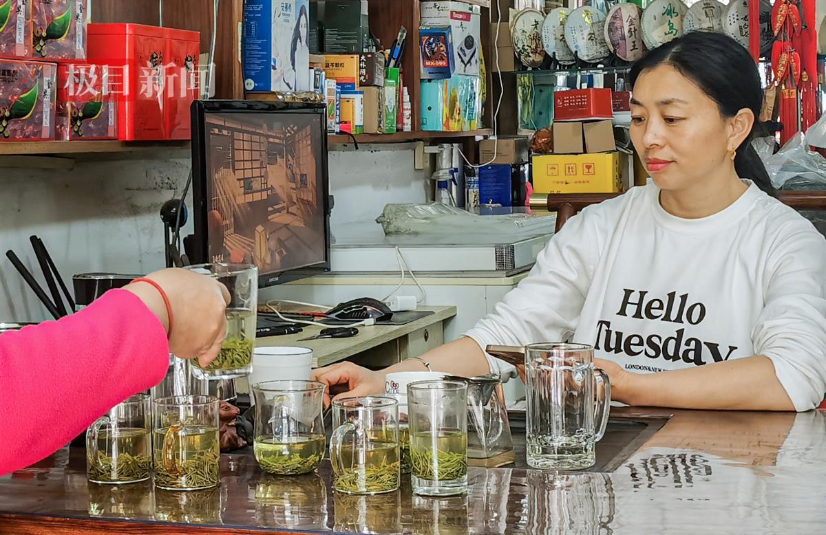 “今年明前茶都已经到了,进来坐坐,喝喝茶。”几乎每走到一家店铺门前,卖茶的老板们都会热情地招呼路人进店品茶。“今年的绿茶品质很高,但是价格不高,可以先品一品。”在一位主营省内绿茶的店铺老板主动引导下,记者走进了一家茶叶铺子。