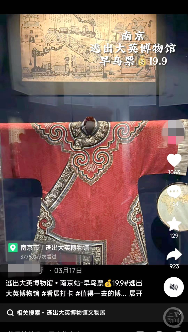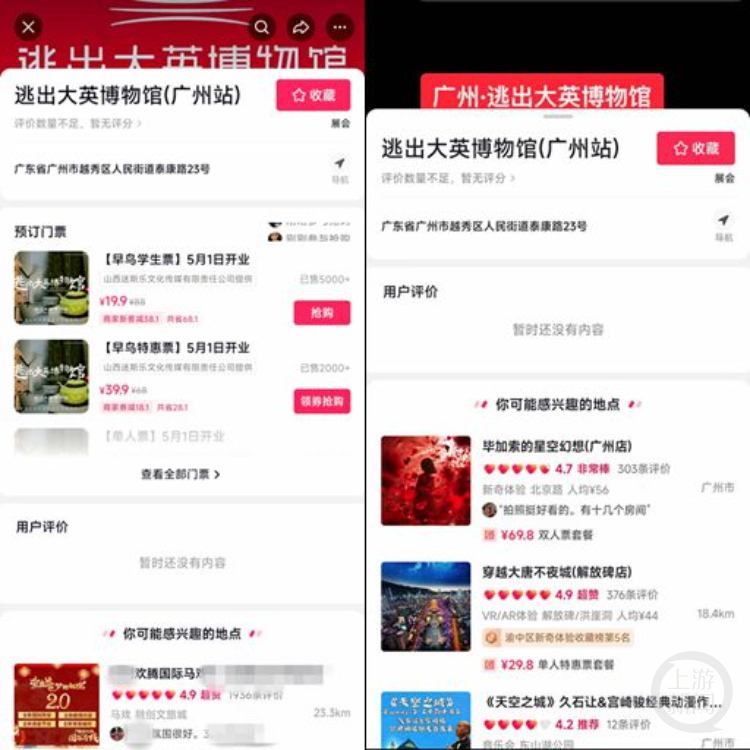 7日上午,上游新闻记者在抖音上看到,“逃出大英博物馆”展在该平台有多个门票销售链接,展览地点涉及武汉、广州、南京、杭州等地。其中武汉展览已于4月4日开幕,其余几个地方都是5月1日才开始。