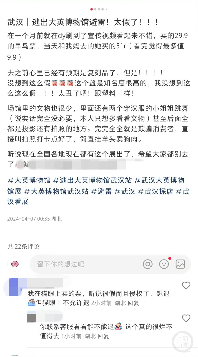 这个名为“逃出大英博物馆”的展览最早于4月4日在武汉开展。上游新闻记者发现,网上出现多起对其的负面评价,认为这个展览“水”“蹭热度”“没啥可看的”“垃圾”……