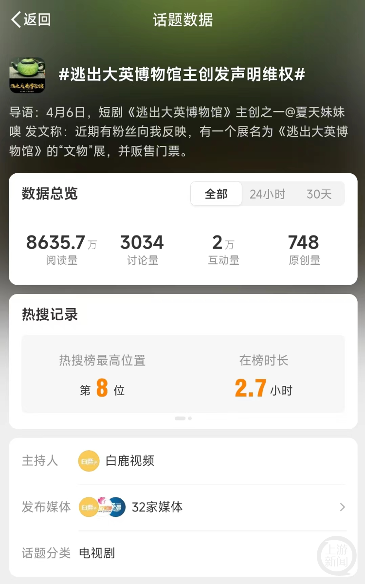 4月6日,该剧两名主创分别发出声明,称有人在没有得到他们授权的情况下,使用其台词为素材在国内多地办“逃出大英博物馆”同名展览。7日,#逃出大英博物馆主创发声明维权#冲上微博热搜第8位,截至发稿浏览量超过8600万。