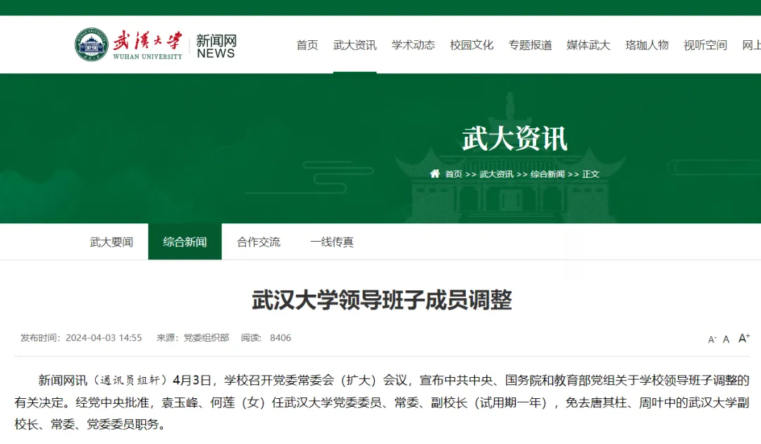 据武汉大学新闻网消息:4月3日,学校召开党委常委会(扩大)会议,宣布中共中央、国务院和教育部党组关于学校领导班子调整的有关决定。经党中央批准,袁玉峰、何莲(女)任武汉大学党委委员、常委、副校长(试用期一年),免去唐其柱、周叶中的武汉大学副校长、常委、党委委员职务。