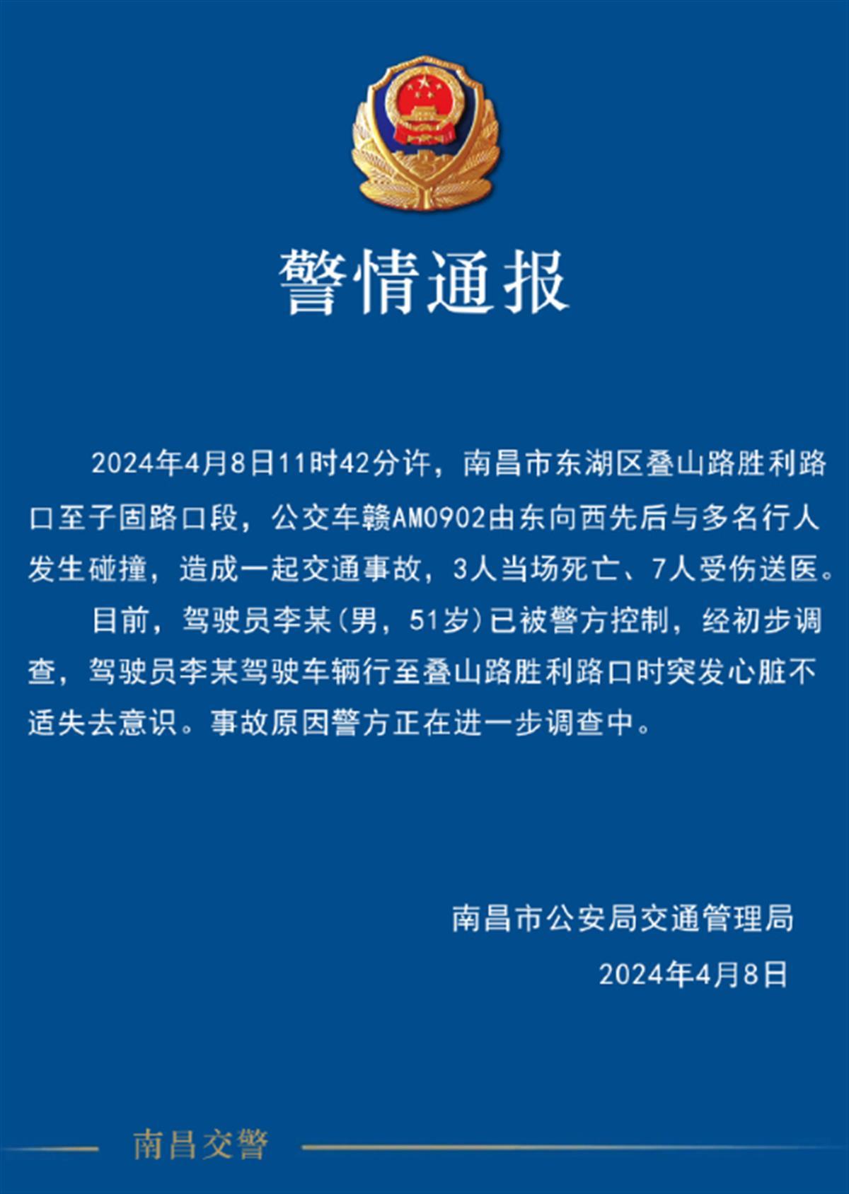 据南昌市公安局交通管理局通报,4月8日11时42分许,南昌市东湖区叠山路胜利路口至子固路口段,公交车赣AM0902由东向西先后与多名行人发生碰撞,造成一起交通事故,3人当场死亡、7人受伤送医。目前,驾驶员李某(男,51岁)已被警方控制,经初步调查,李某驾驶车辆行至叠山路胜利路口时突发心脏不适失去意识。事故原因警方正在进一步调查中。