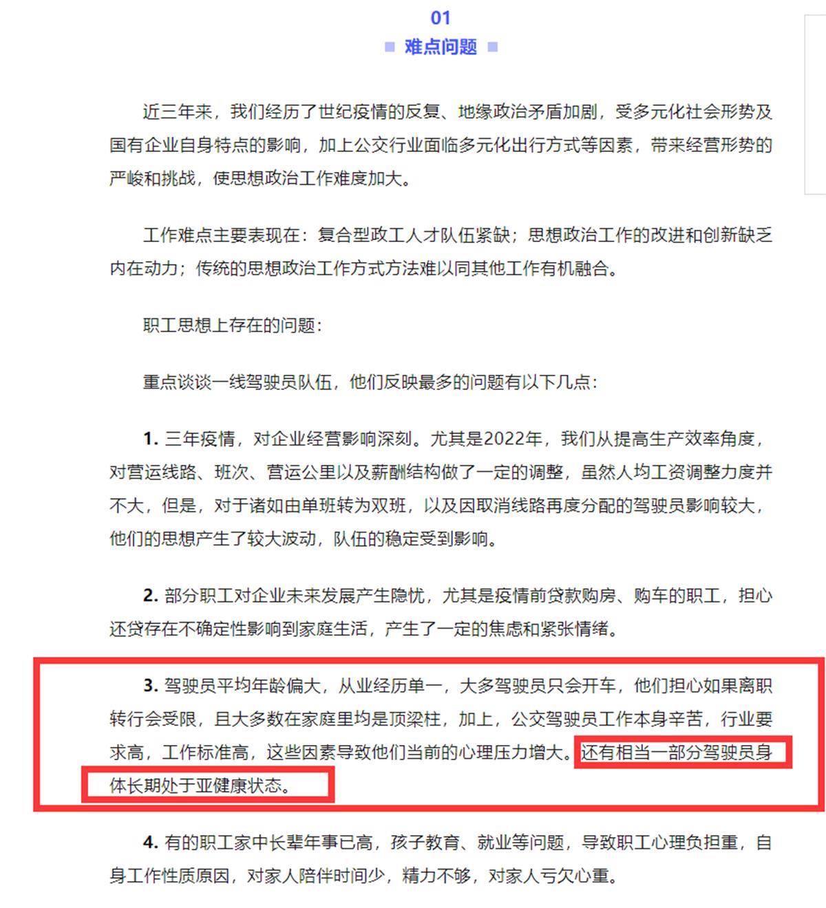 记者注意到,该集团一领导撰写的文章于2024年1月9日在集团微信公号发布,文中曾指出职工目前存在的问题。其中提到,驾驶员平均年龄偏大,从业经历单一,大多驾驶员只会开车。他们担心如果离职转行会受限,且大多数在家庭里均是顶梁柱,加上公交驾驶员工作本身辛苦,行业要求高,工作标准高,这些因素导致他们当前的心理压力增大;还有相当一部分驾驶员身体长期处于亚健康状态。