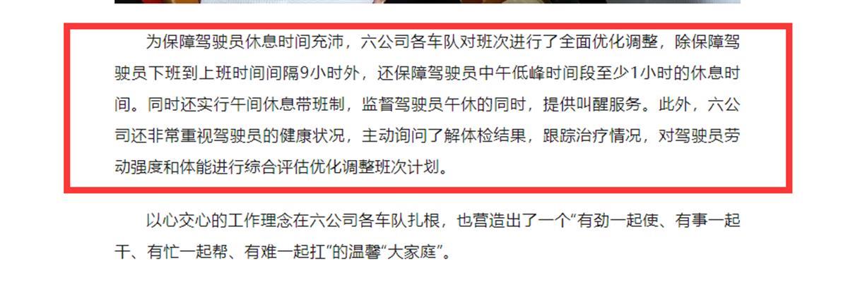 1月16日,南昌公交运输集团六公司发布在公交集团微信公众号上的文章称,为保障驾驶员休息时间充沛,六公司各车队对班次进行了全面优化调整,除保障驾驶员下班到上班时间间隔9小时外,还保障驾驶员中午低峰时间段至少有1小时的休息时间。同时还实行午间休息带班制,监督驾驶员午休的同时,提供叫醒服务。此外,六公司还非常重视驾驶员的健康状况,主动询问了解体检结果,跟踪治疗情况,对驾驶员劳动强度和体能进行综合评估优化调整班次计划。