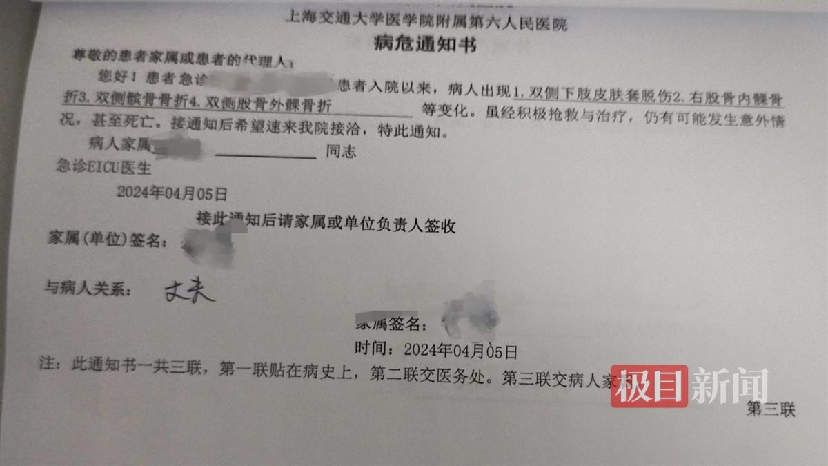 事发后,卢先生妻子被送医抢救,后转院至上海交通大学医学院附属第六人民医院,抢救持续到5日凌晨。医院5日下达的病危通知书显示,卢先生妻子入院以来,出现了双侧下肢皮肤套脱伤、右股骨内髁骨折、双侧髌骨骨折、双侧股骨外髁骨折等变化。