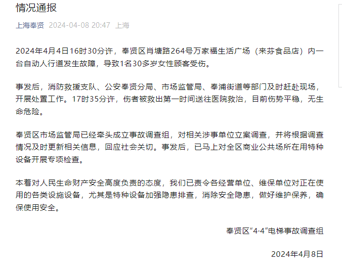 2024年4月4日16时30分许,奉贤区肖塘路264号万家福生活广场(来芬食品店)内一台自动人行道发生故障,导致1名30多岁女性顾客受伤。