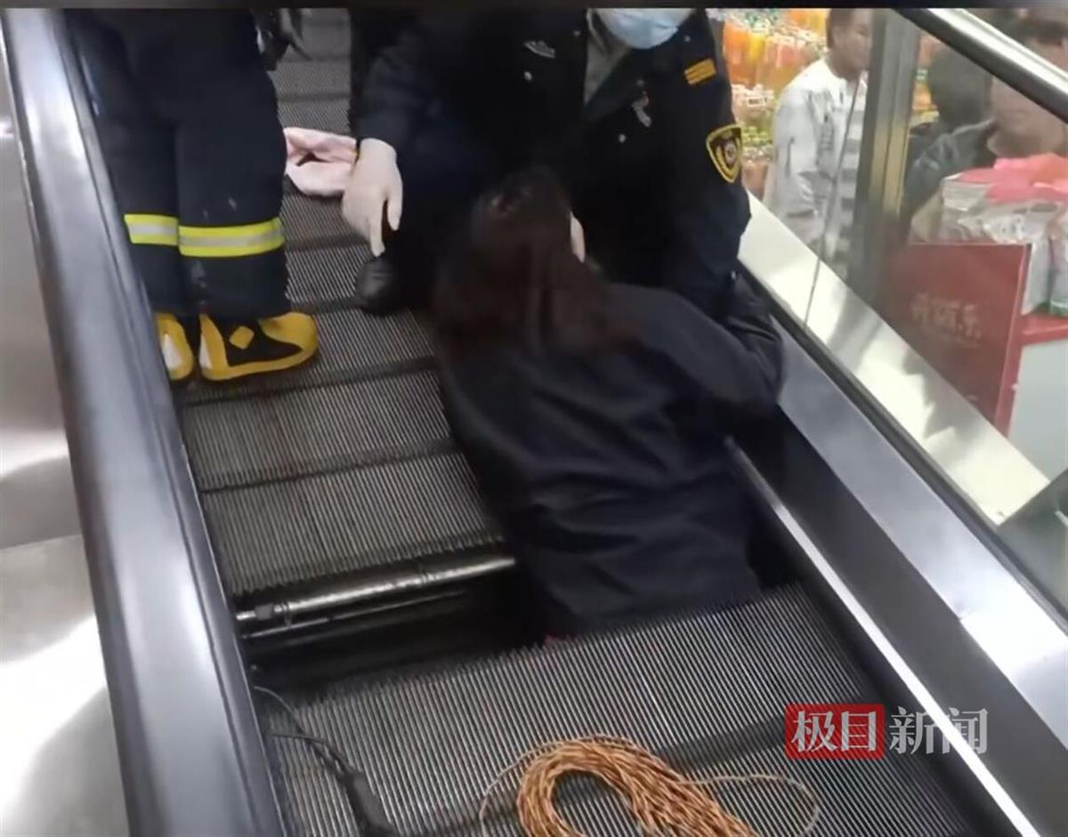 极目新闻此前报道,受伤女子丈夫卢先生发布的事发时的监控视频显示,其妻子走上一处超市内上行的斜坡自动扶梯,突然掉入电梯中被困,电梯在继续运转,两名路人见状赶紧按下紧急制动按钮。不少网友也称,画面中,扶梯有一块是缺失的,卢先生妻子恰好踩了上去。