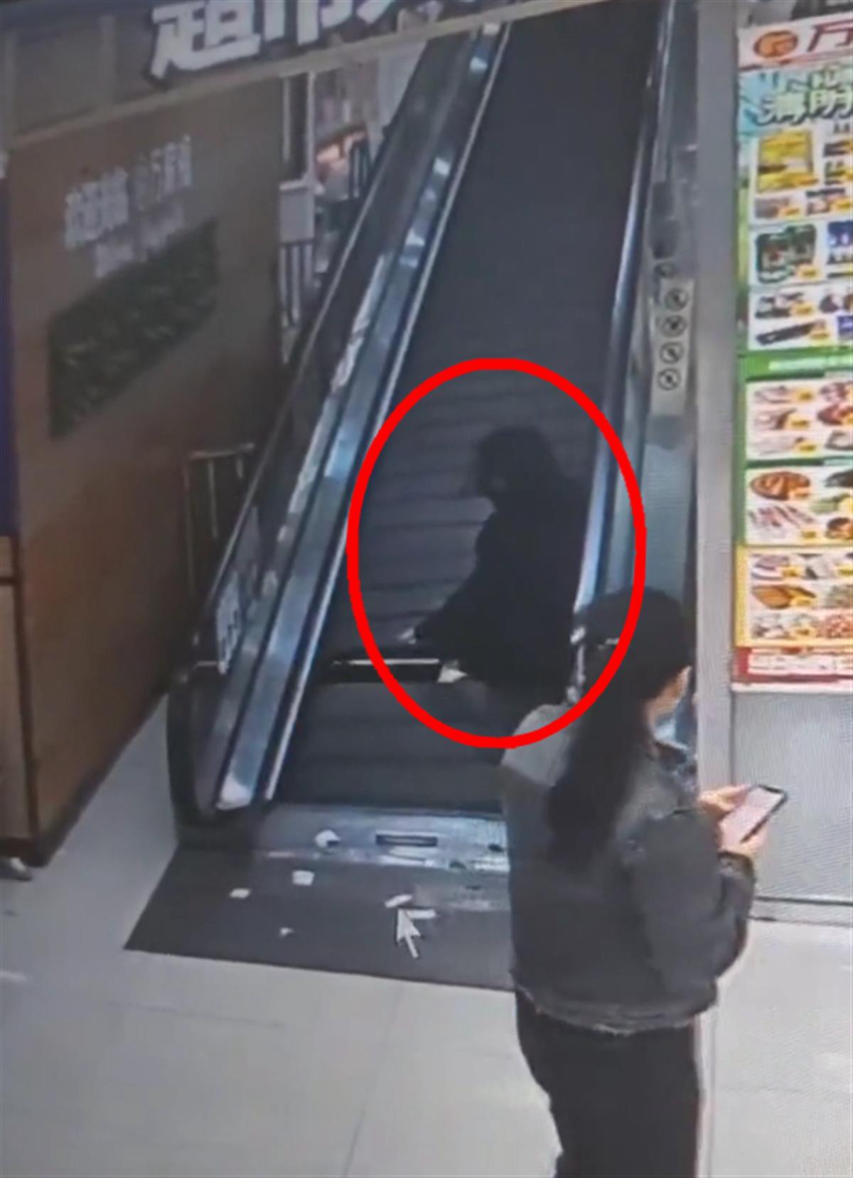 女子丈夫卢先生发布的事发时监控视频显示,其妻子走上一处超市内上行的自动扶梯,突然掉入电梯中被困。视频可见,其妻子踩到了扶梯上一处踏板缺失的缝隙,但电梯继续运行了一段距离。现场一名女子和一名男子见状,赶紧寻找并成功按下了紧急制动按钮,电梯停止运行。