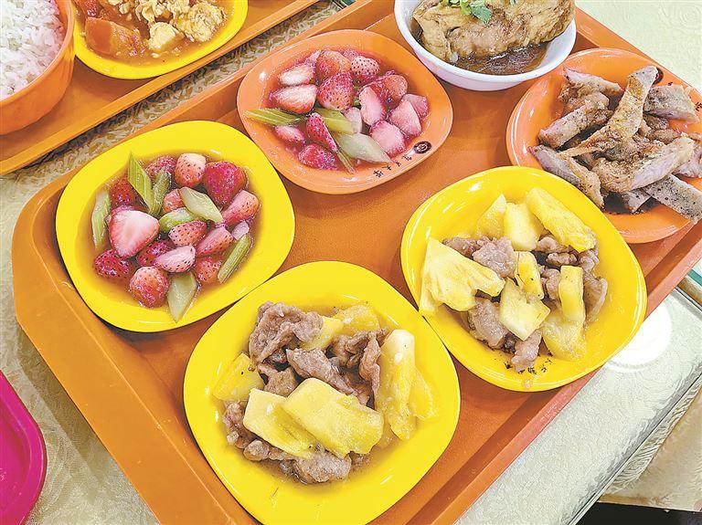 昨日中午11时,集美大学万人食堂一楼自选窗口前,摆放着的草莓炒芹菜、菠萝炒肉、哈密瓜炒鱼等特色菜,不禁让人眼前一亮。菜品色彩丰富,路过的学子们纷纷停下脚步,掏出手机拍照打卡。