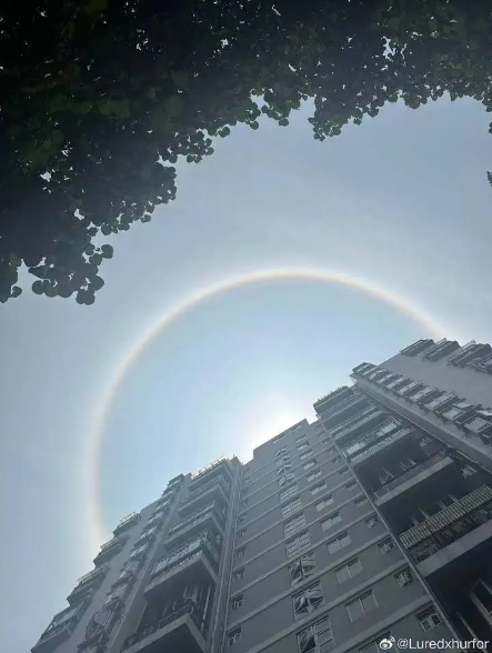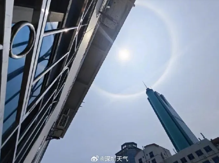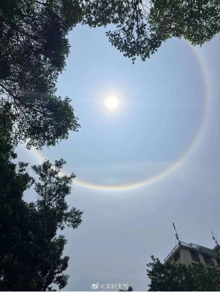 据@深圳天气,这一天文现象是日晕,一种大气光学现象,是日光通过卷层云时,受到冰晶的折射或反射而形成。